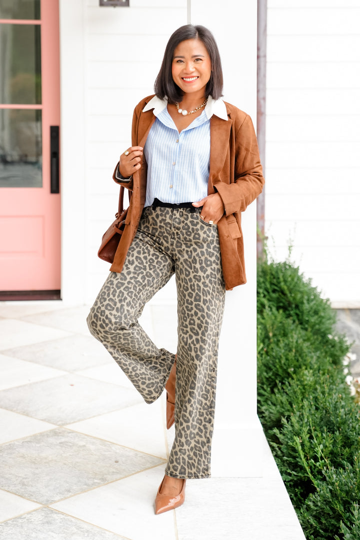 Risen High Rise Leopard Wide Leg Pants with Contrasting Waistband