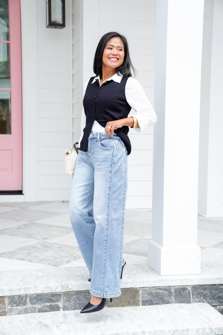 Risen High Rise Black Double Button Wide Leg Jeans