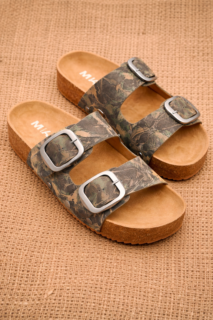 MIA Camo Print Double Buckle Cork Footbed Sandal