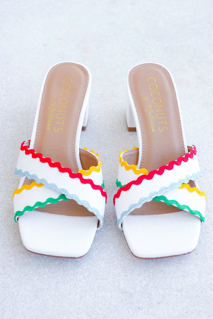 Block Heel Slide Sandals with Colorful Wavy Trim Accents