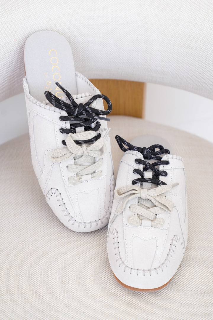 Slip On Mule with Moccasin Toe Stitching and Lace Up Detail