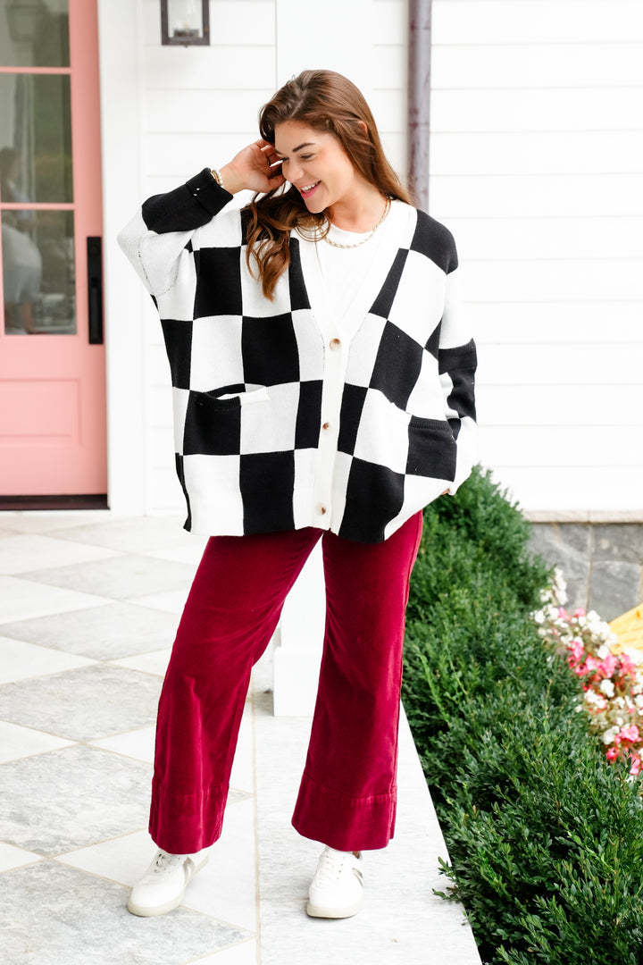 Long Sleeve Button Down Cardigan with Checker Print