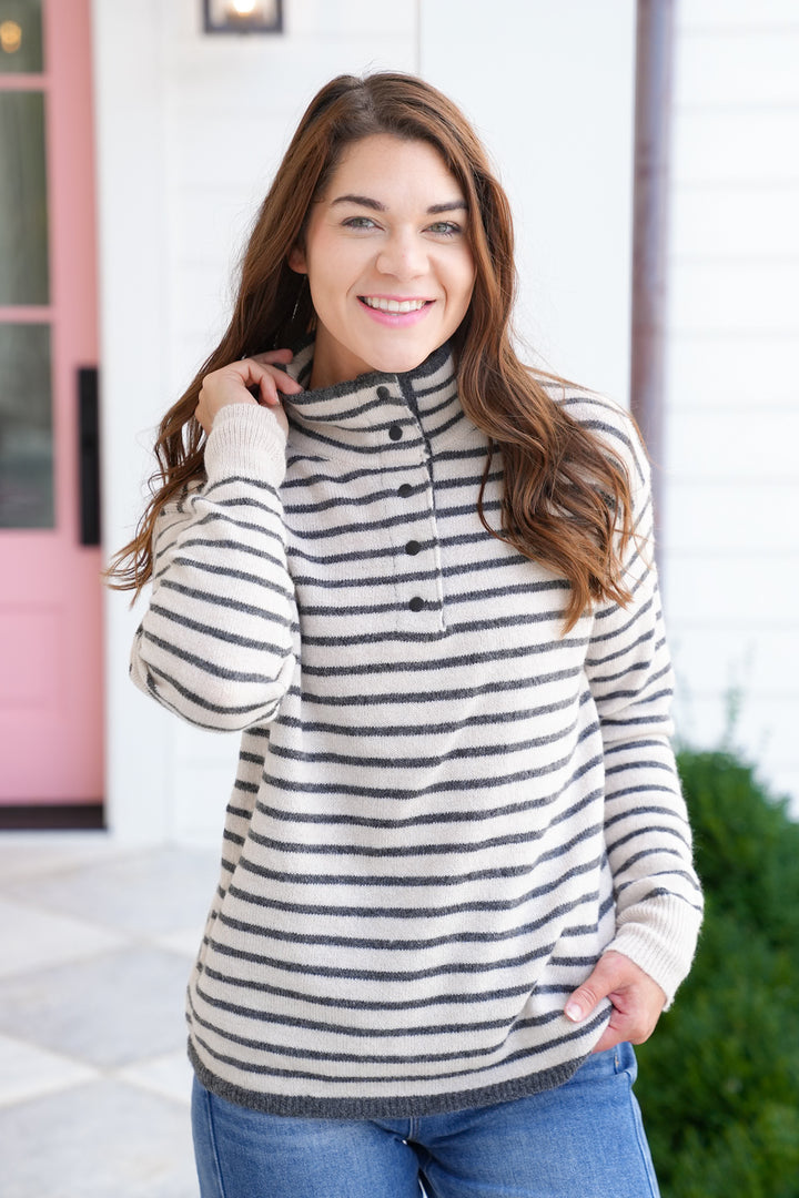 Plus/Reg Mock Neck Pullover Striped Sleeve Sweater