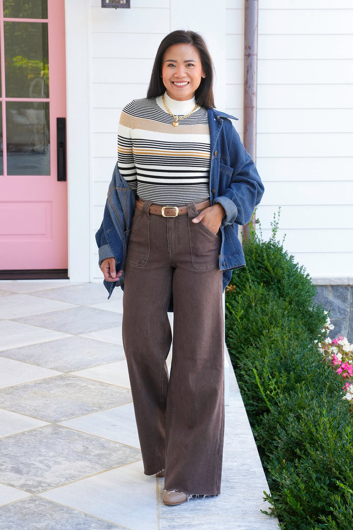 Ribbed Stripe Long Sleeve Mock Neck Sweater