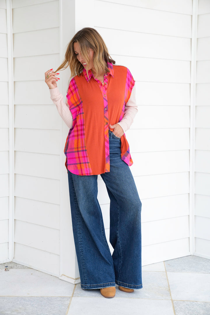 Thermal Long Sleeve Button Down Top with Plaid Detail