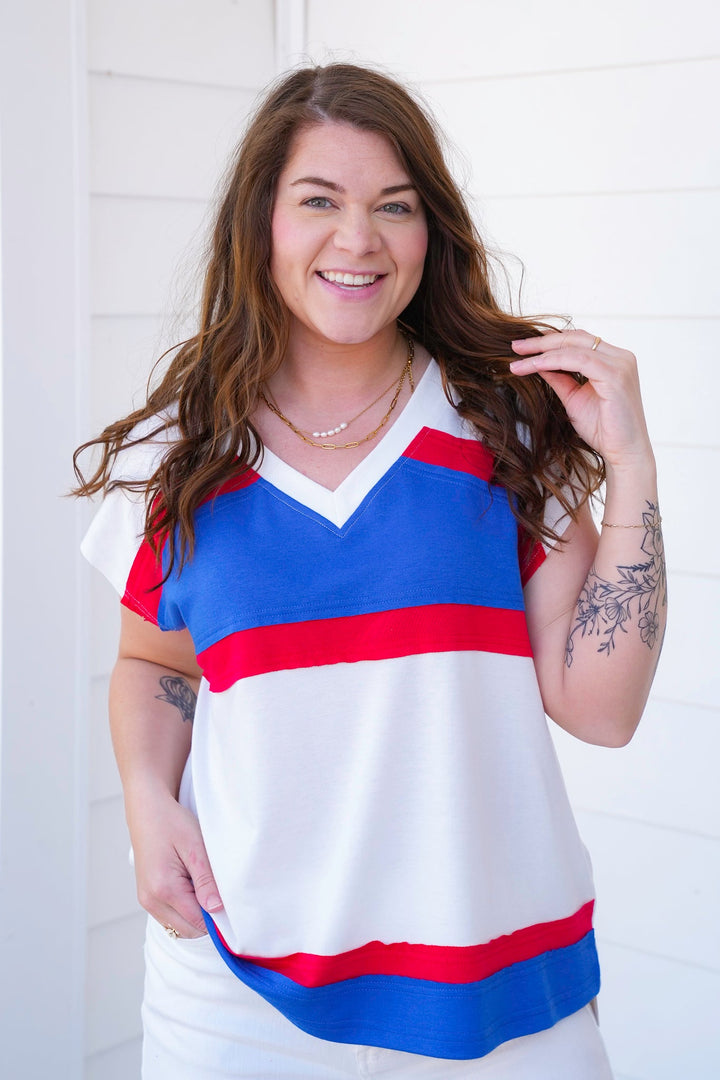 Short Ruffle Sleeve Round Neck Top with Stripe Detail