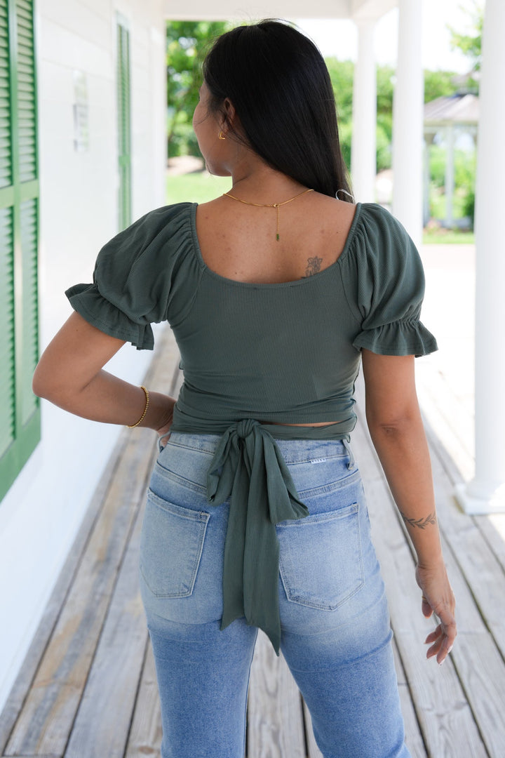 Olive Ribbed Knit Short Sleeve Top With Tie Detail