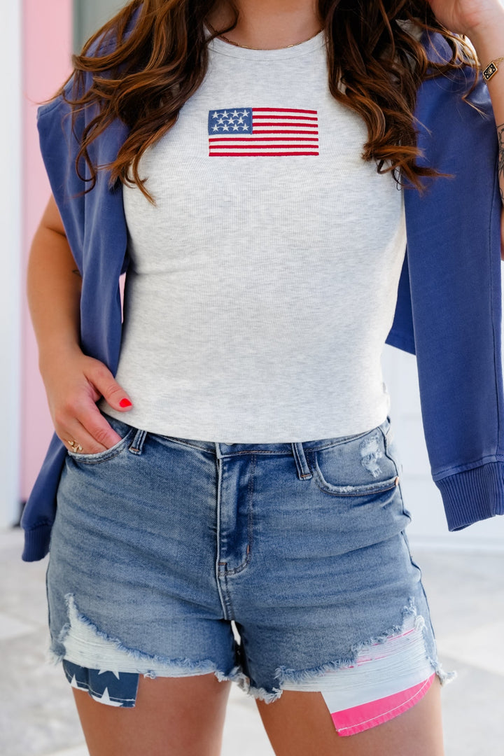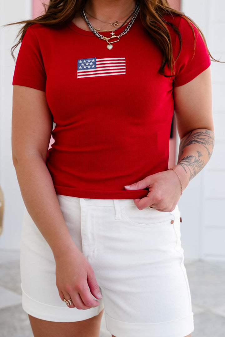 Red Short Sleeve Top with Embroidered American Flag Patch