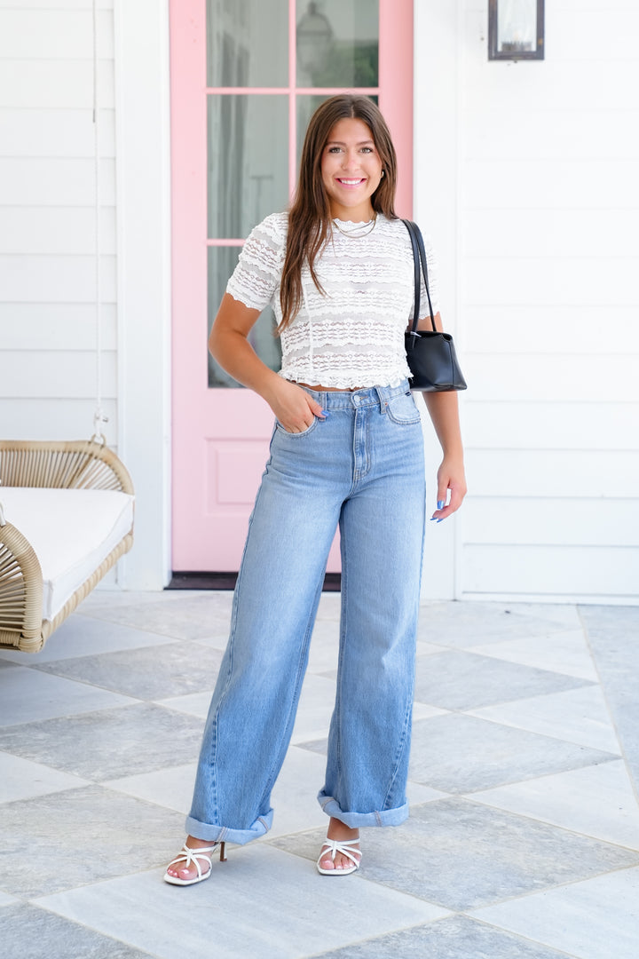 Short Sleeve Button Down Top with Floral and Lace Detail