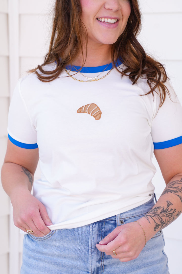 Short Sleeve Knit Top with Croissant Embroidered Detail
