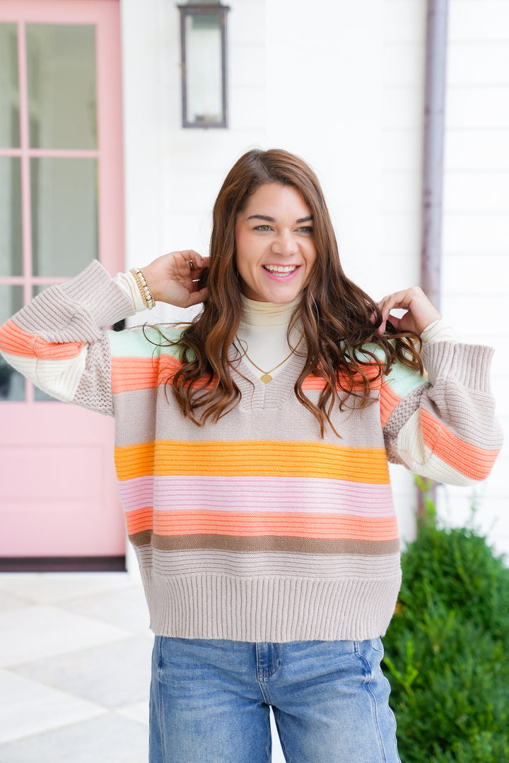 Multi Color Stripe Long Sleeve V Neck Sweater