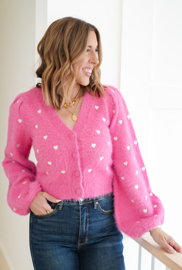 Balloon Long Sleeve Heart Embroidered Cardigan