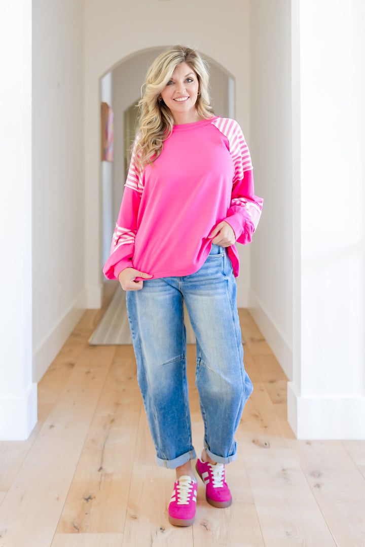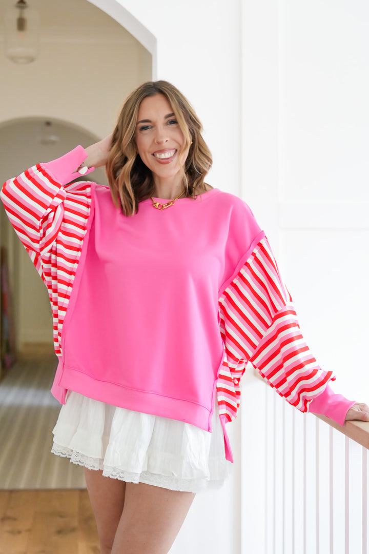 Long Stripe Sleeve Pullover Top with Reverse Seams