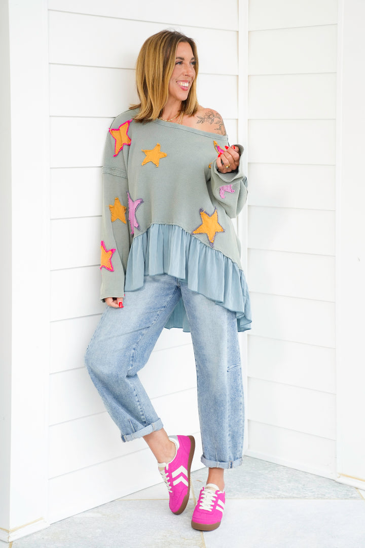 Star Patch Long Sleeve Ruffle Hem Top