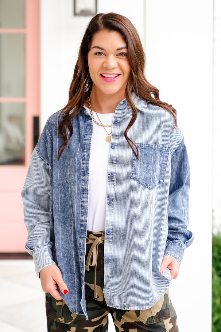 Color Block Stripe Long Sleeve Button Down Top
