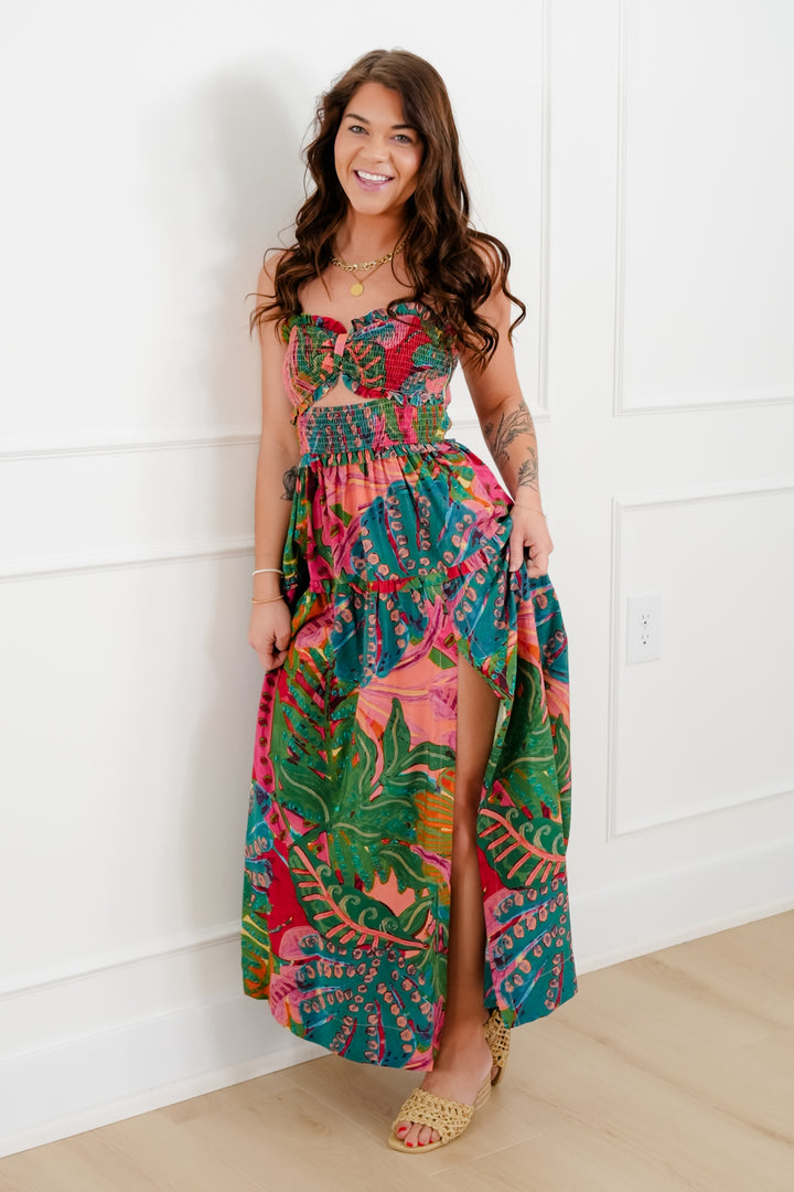 Tropical Print Sleeveless Smocked Bodice Maxi Dress