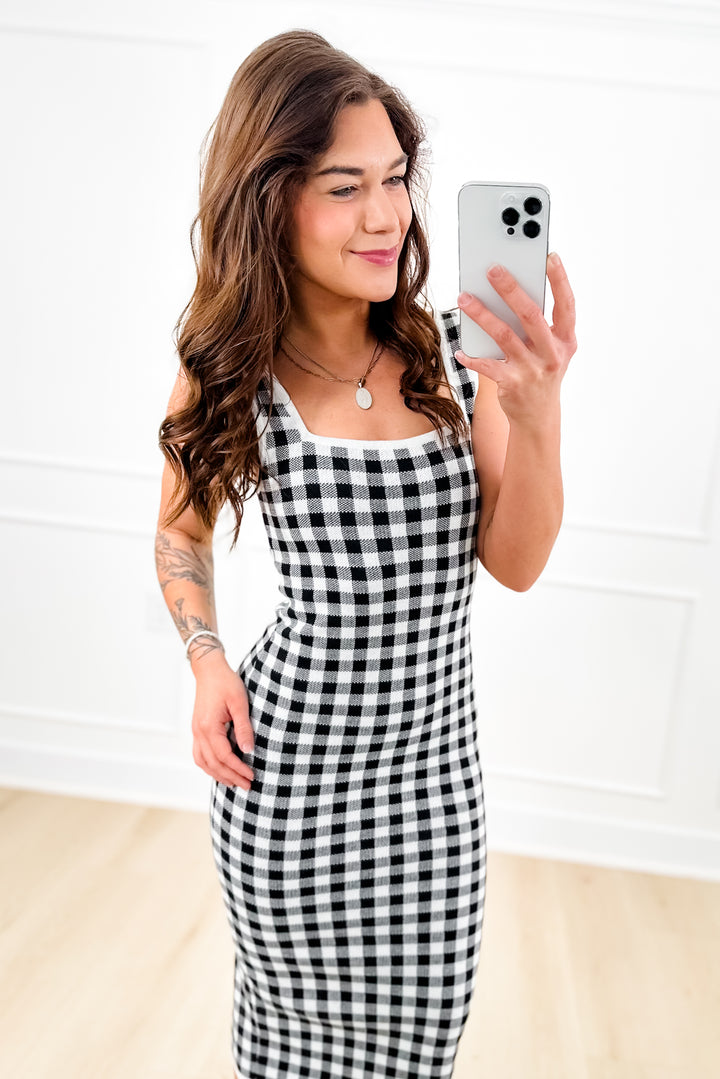Plus/Reg Gingham Knit Sleeveless Square Neck Midi Dress