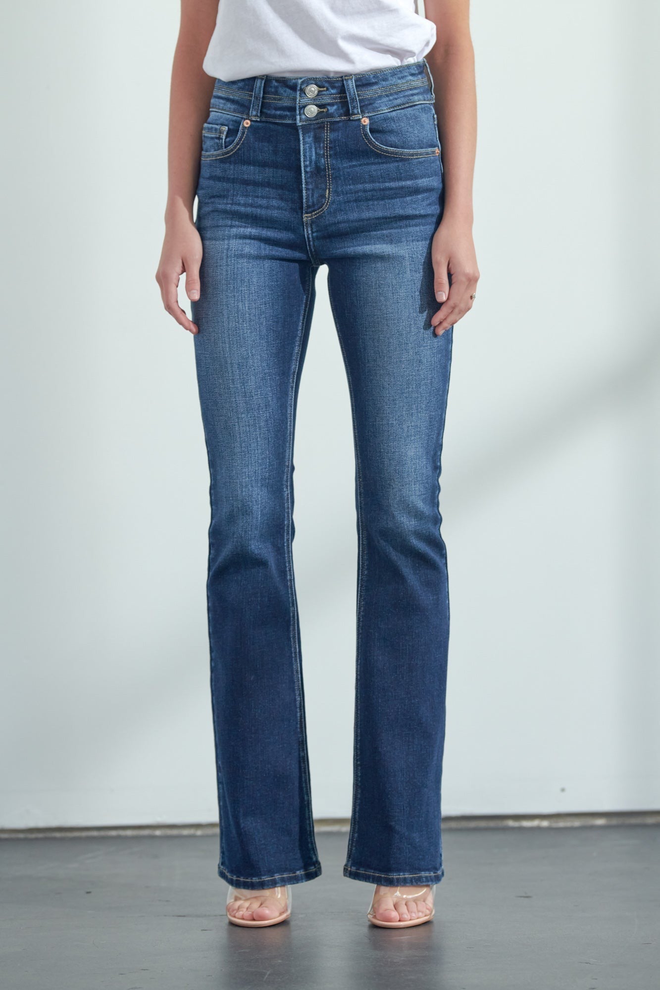 Artemis High Rise Dark Wash Double Waistband Bootcut Jeans
