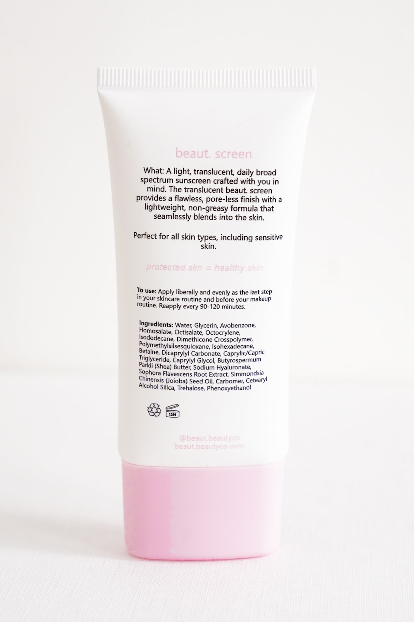 What: A light, translucent, daily broad spectrum sunscreen crafted with you in mind. The translucent beaut. screen provides a flawless, pore-less finish with a lightweight, non-greasy formula that seamlessly blends into the skin. SPF 40.
