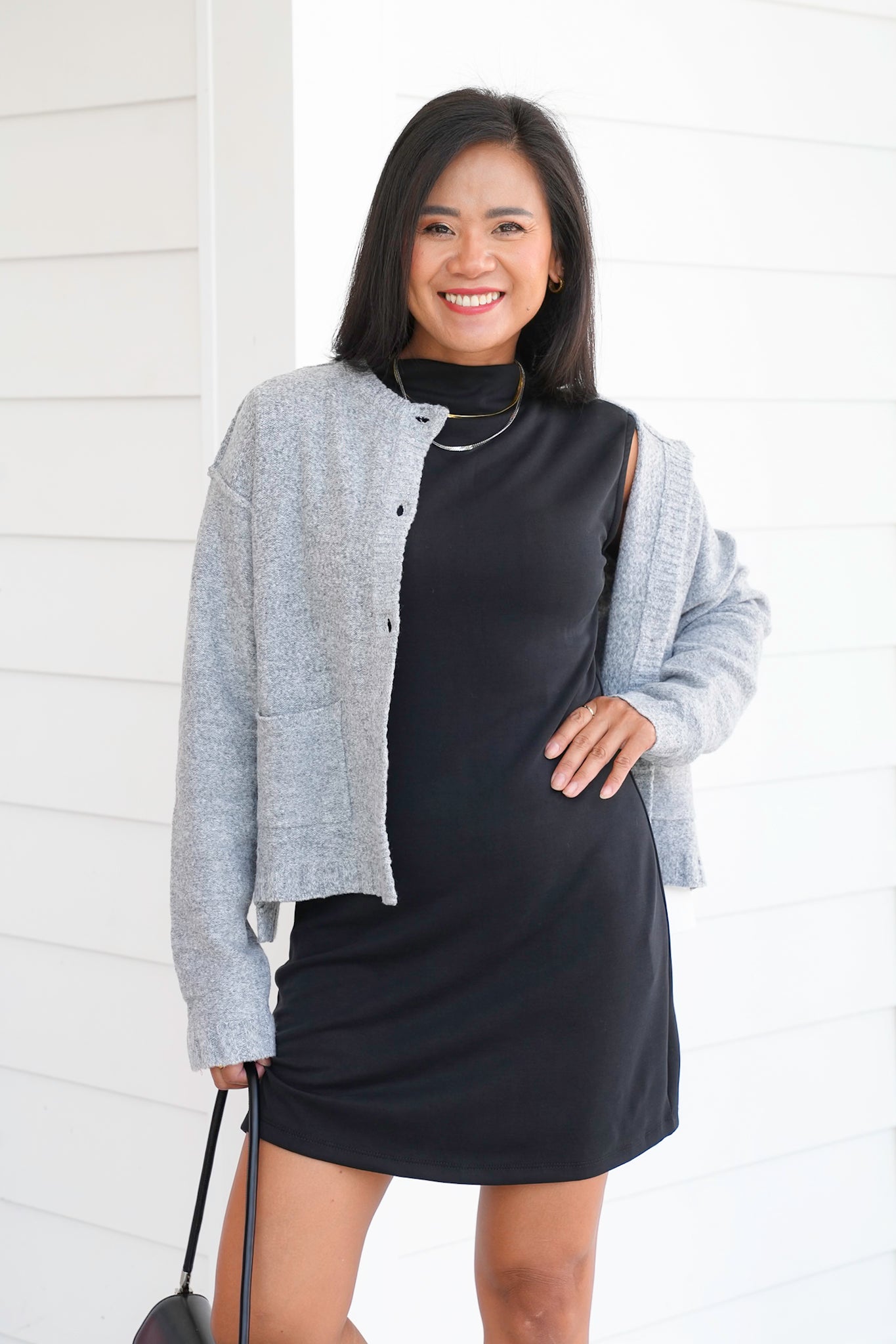 This black mini dress is the definition of effortless polish. The mock neck and streamlined shape keep it feeling modern and versatile, while the athletic knit adds that easygoing comfort that makes it a go-to for busy days or dressed-up nights. Style it with boots, sneakers, or heels and you’re instantly pulled together without overthinking it.