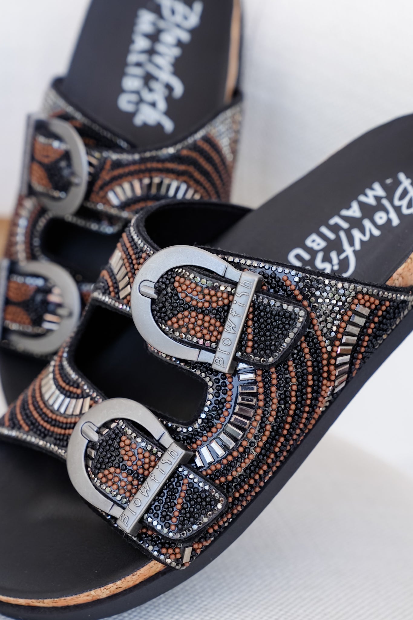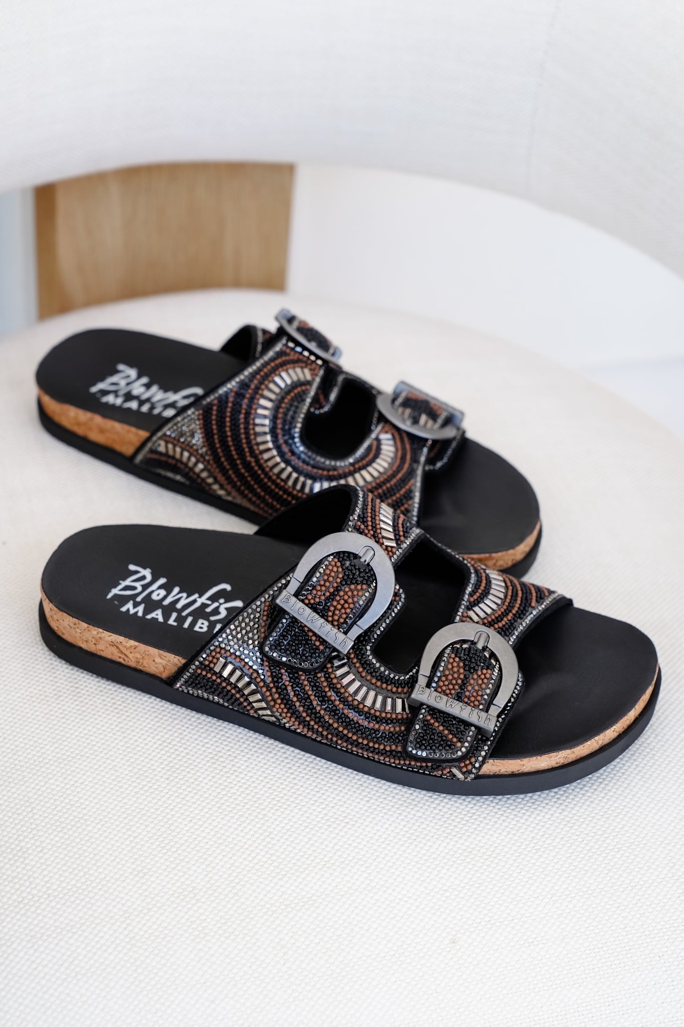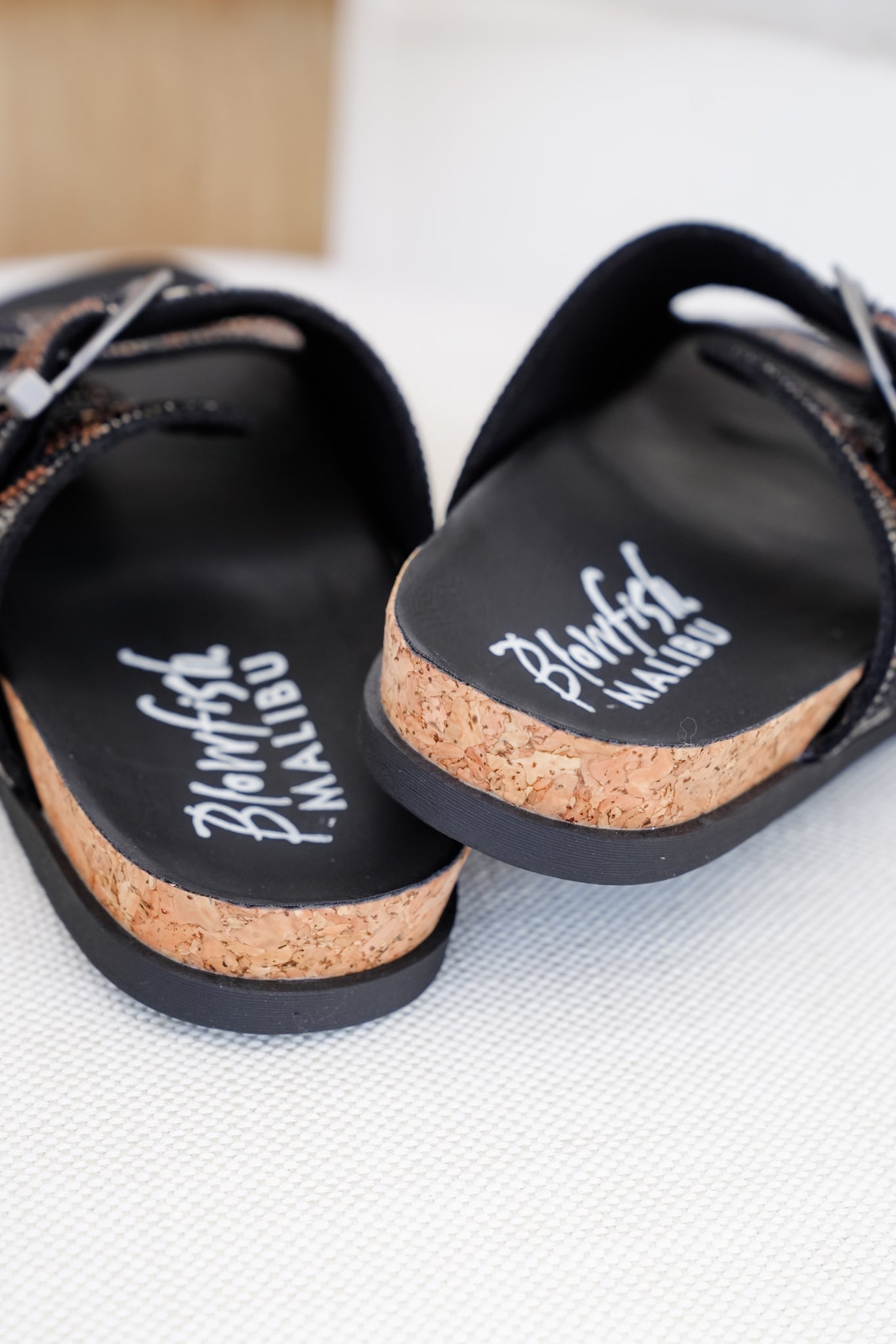 Blowfish Embellished Cork Slide Sandals with Adjustable Buckle Detail