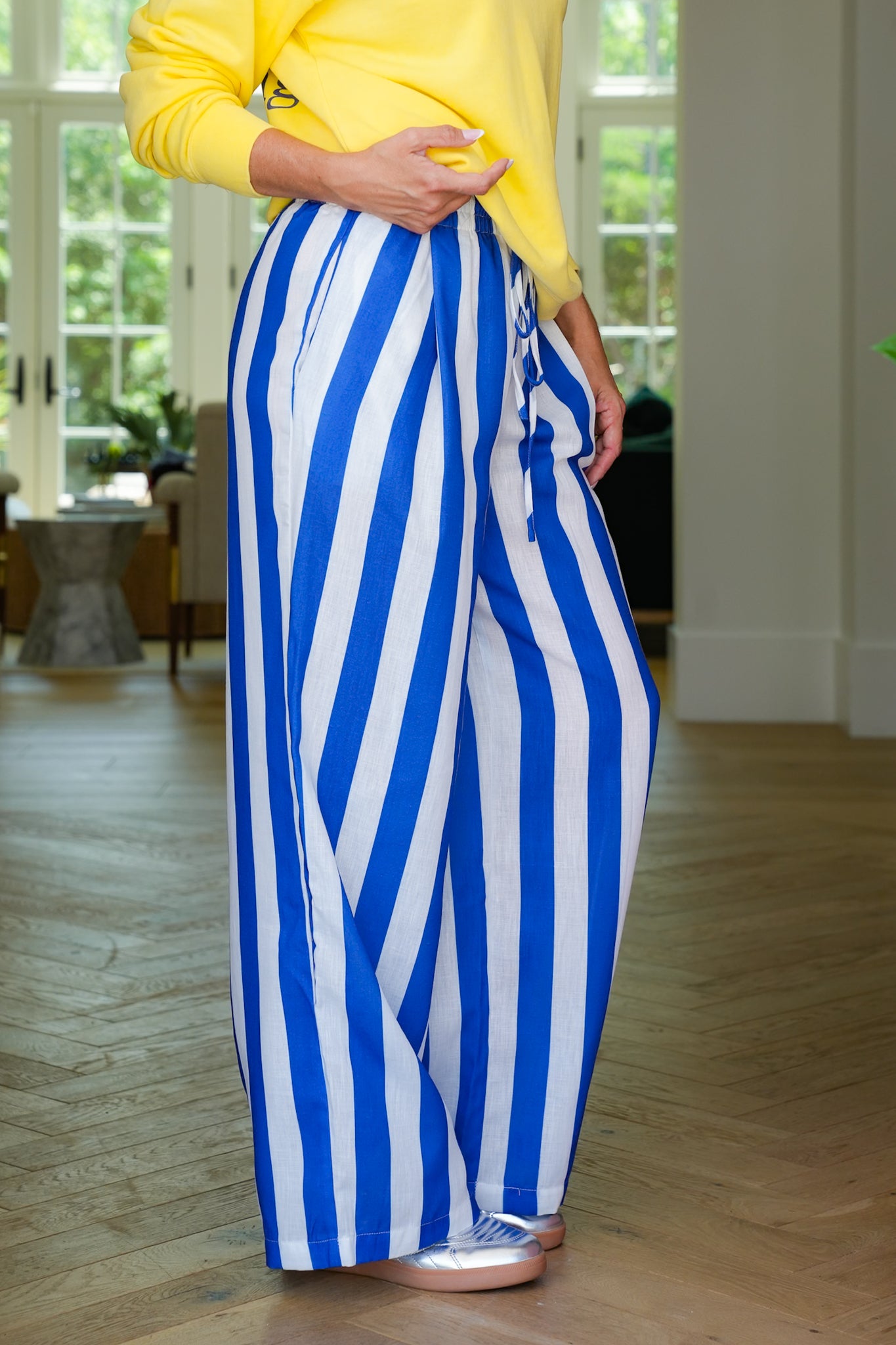 Blue Stripe Elastic Waist Wide Leg Pants