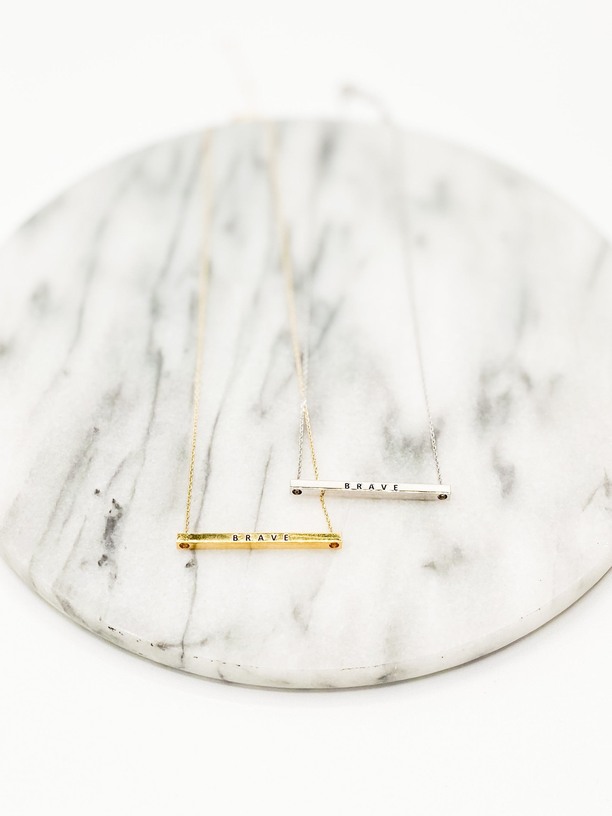 * Sleek bar pendant engraved with the word “Brave”