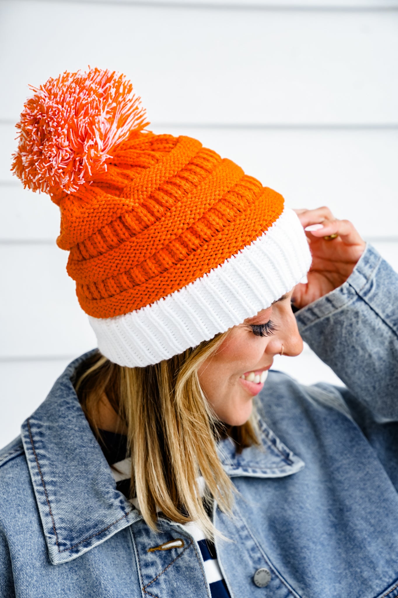 Top off your game day look with this playful pom beanie in your team colors! The thick knit keeps you toasty while the bold pom adds a little flair to your cold-weather style. Whether you're in the stands or on snack duty, this beanie brings the team spirit and the cozy factor. Pair it with a puffer, flannel, or hoodie and you'll be repping your team loud and proud.