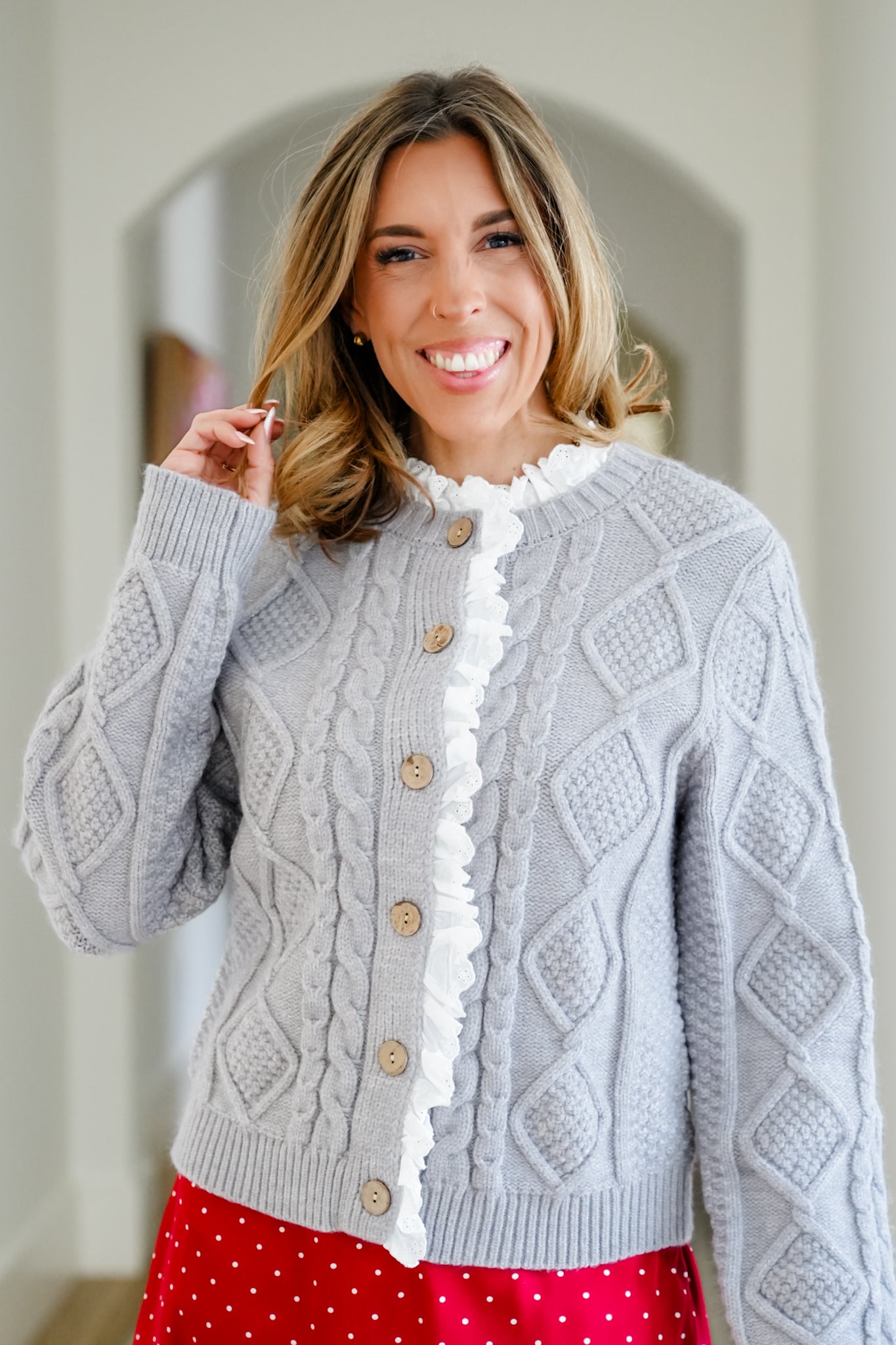 This cardigan feels cozy and polished at the same time. The eyelet trim adds a feminine touch, and the cable knit texture keeps it classic. Layer it over blouses, tanks, or dresses for a soft, styled finish.
