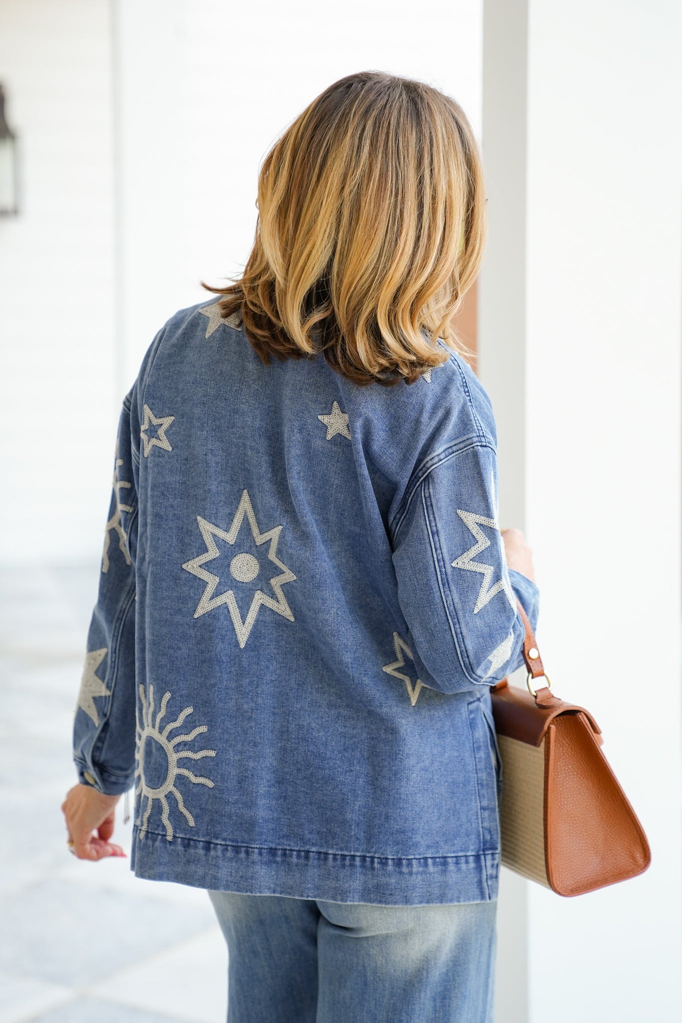 Add a little cosmic charm to your wardrobe with this embroidered button-down jacket. The celestial stitching pops against the denim, giving it a chic yet playful vibe. Pair it with your favorite graphic tank or toss it over a midi dress for a fun, laid-back look.