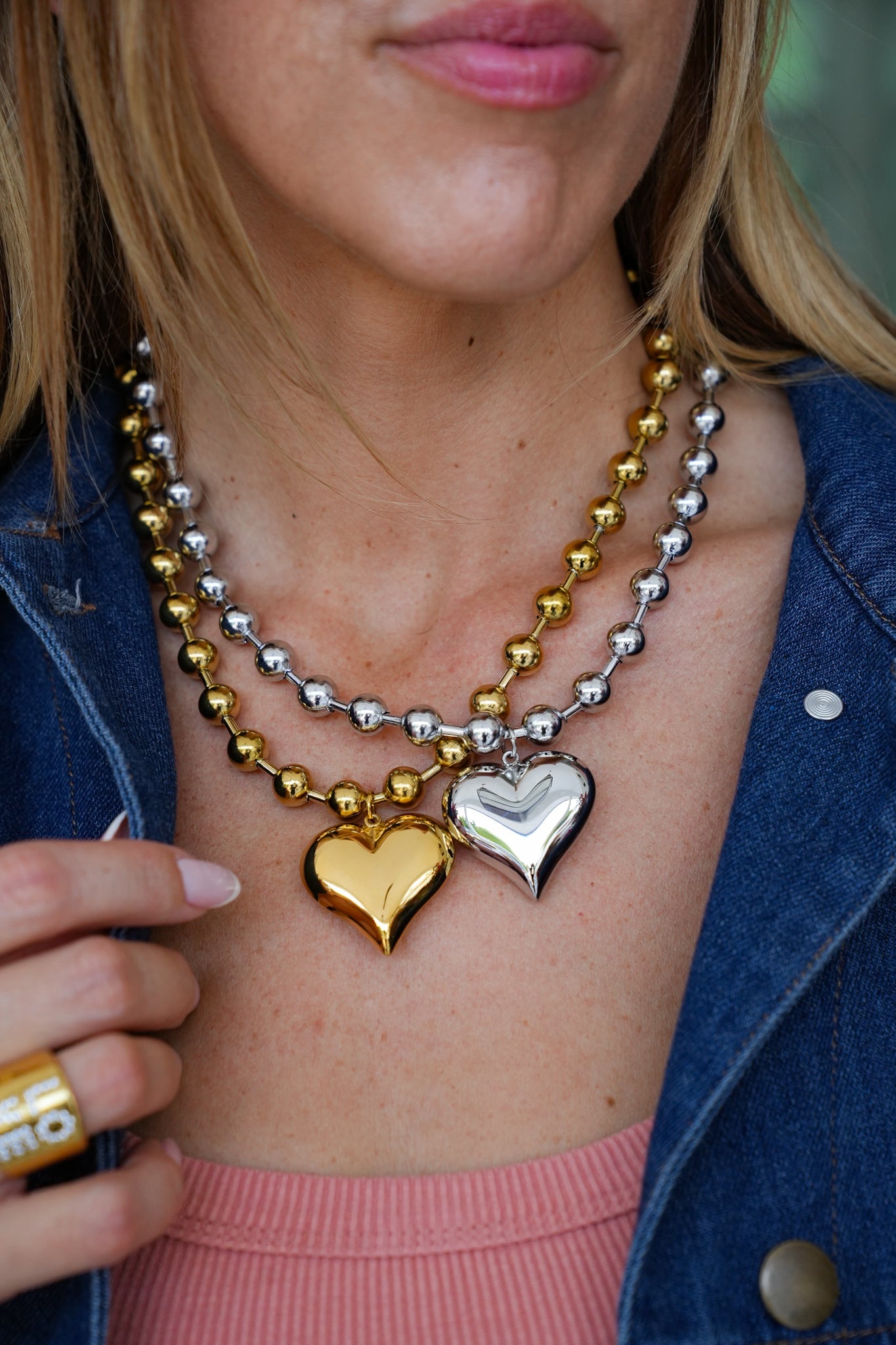 Bold, bubbly, and a total conversation starter—this necklace is serving heartthrob energy in the best way! With oversized pearl-inspired beads and a glossy, puffy heart pendant in either gold or silver (or both if you’re feeling extra), this piece makes a loud and lovable statement.