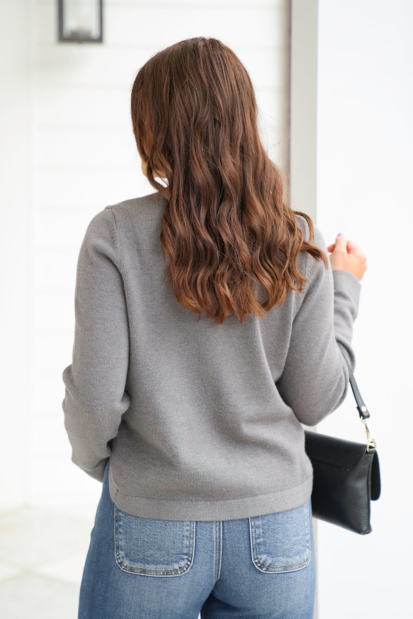 This charcoal crew neck sweater is all about elevated simplicity with a fun twist! The soft knit has a luxe feel you’ll love, and the side button detail adds just the right amount of charm to make it stand out from your everyday basics. Finished with a flattering dolphin hem, it’s an easy piece to style for work, weekends, or anything in between.