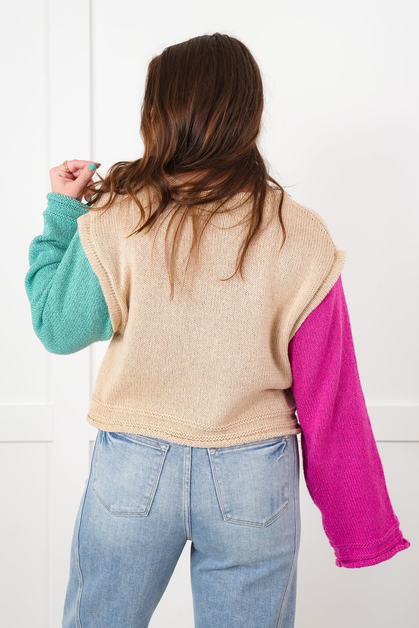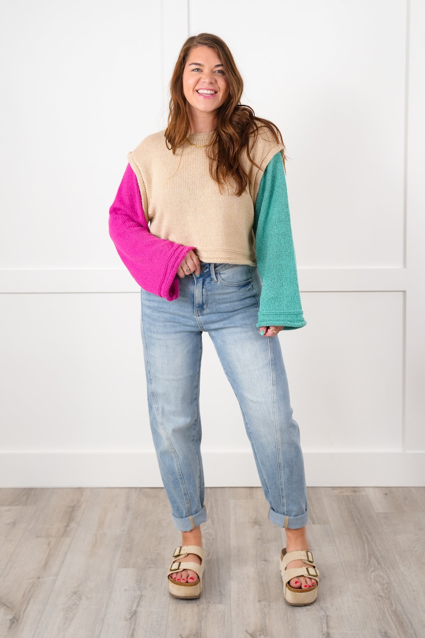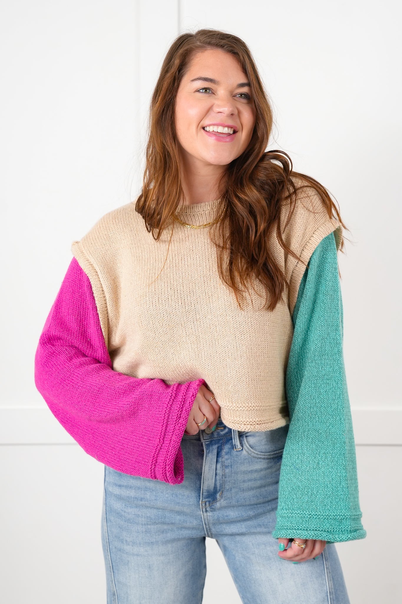 Bold, playful, and packed with personality, this color block sweater is a total standout! With vibrant contrasting sleeves and a neutral body, it brings instant energy to your look while keeping things effortlessly relaxed. Pair it with distressed jeans and booties for weekend hangs or dress it up with faux leather leggings and gold hoops for casual glam.