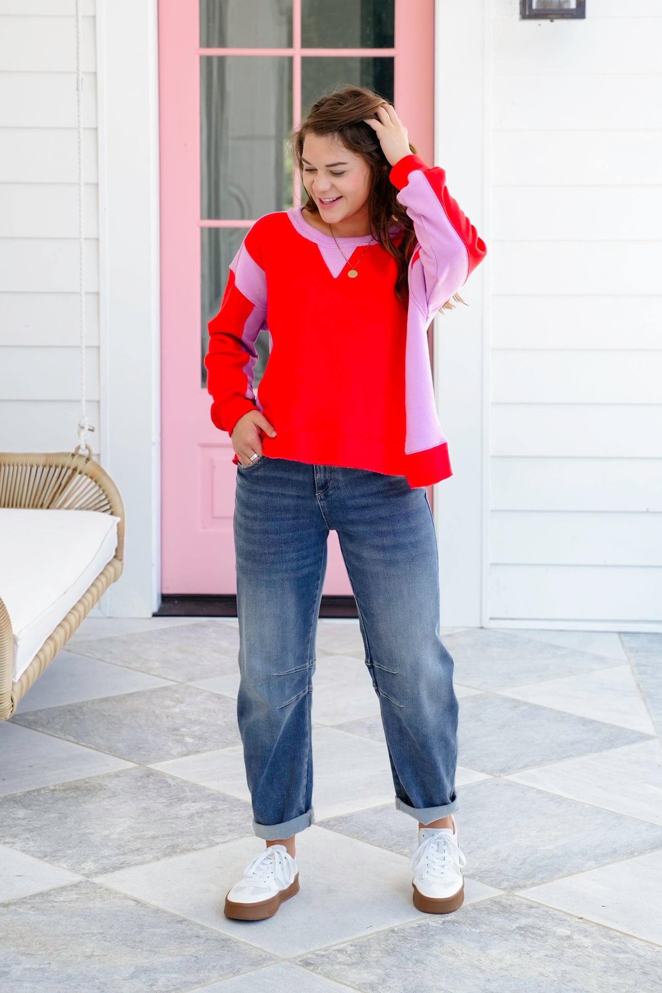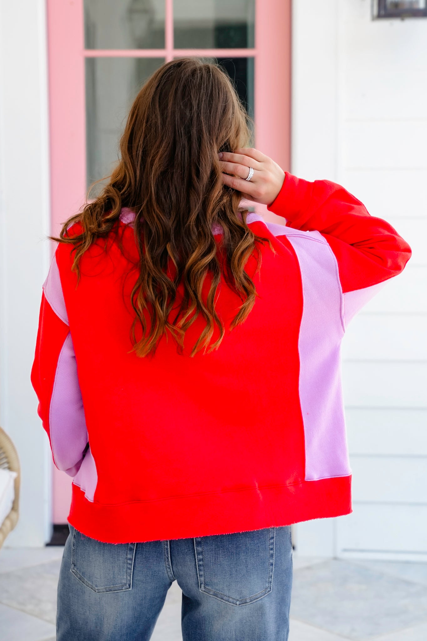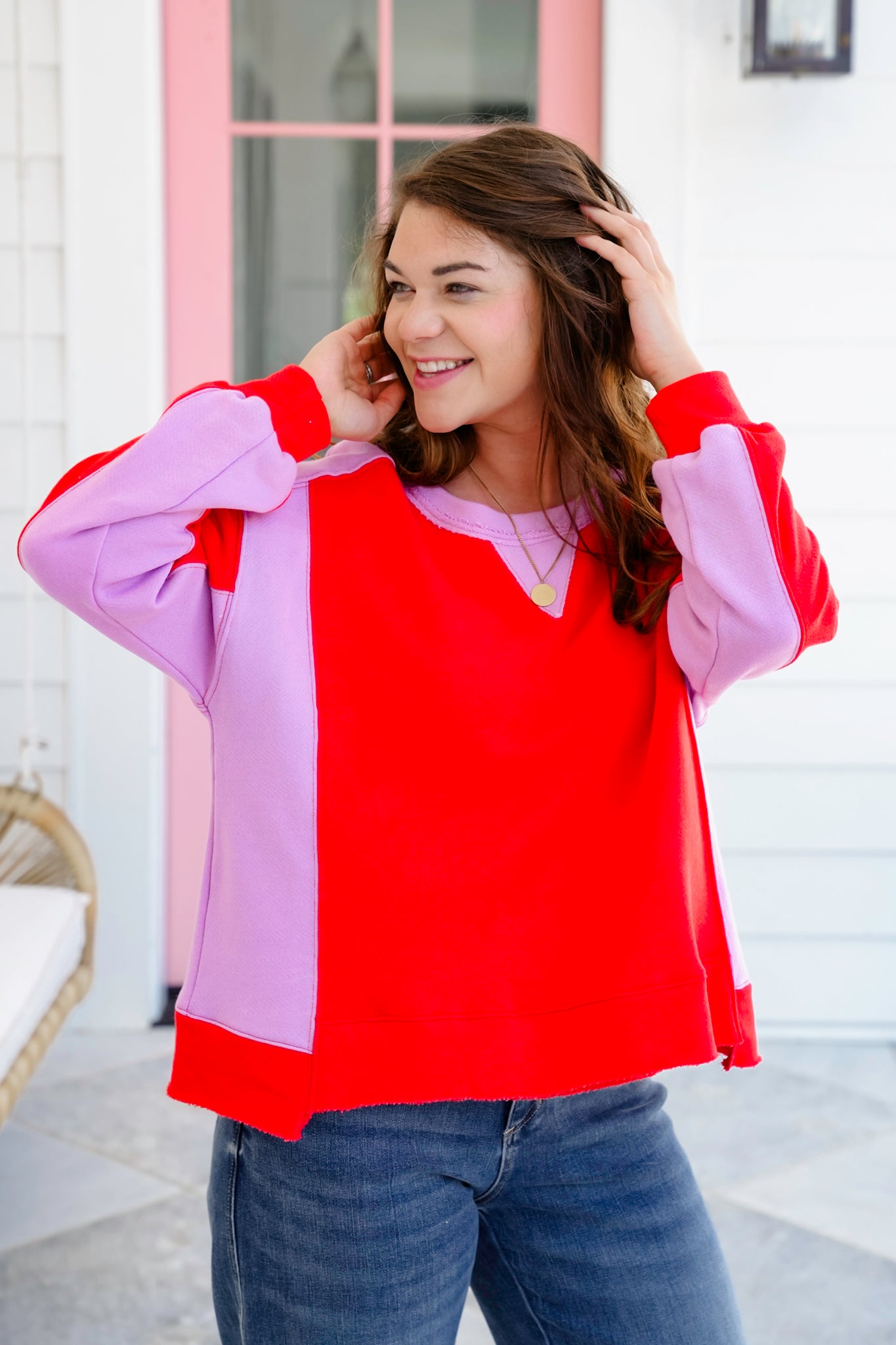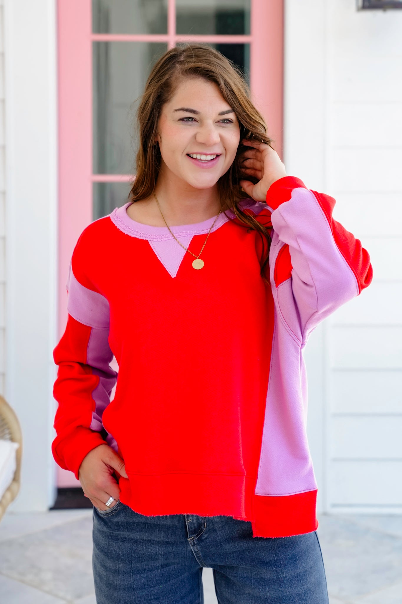 This bold and playful pullover is making a major statement with its striking red and lilac color block combination. The step hem adds just the right amount of edge, and the soft French terry feel makes it a perfect go-to for chill days when you still want to look cute. It’s eye-catching, cozy, and made for showing off your fun side.