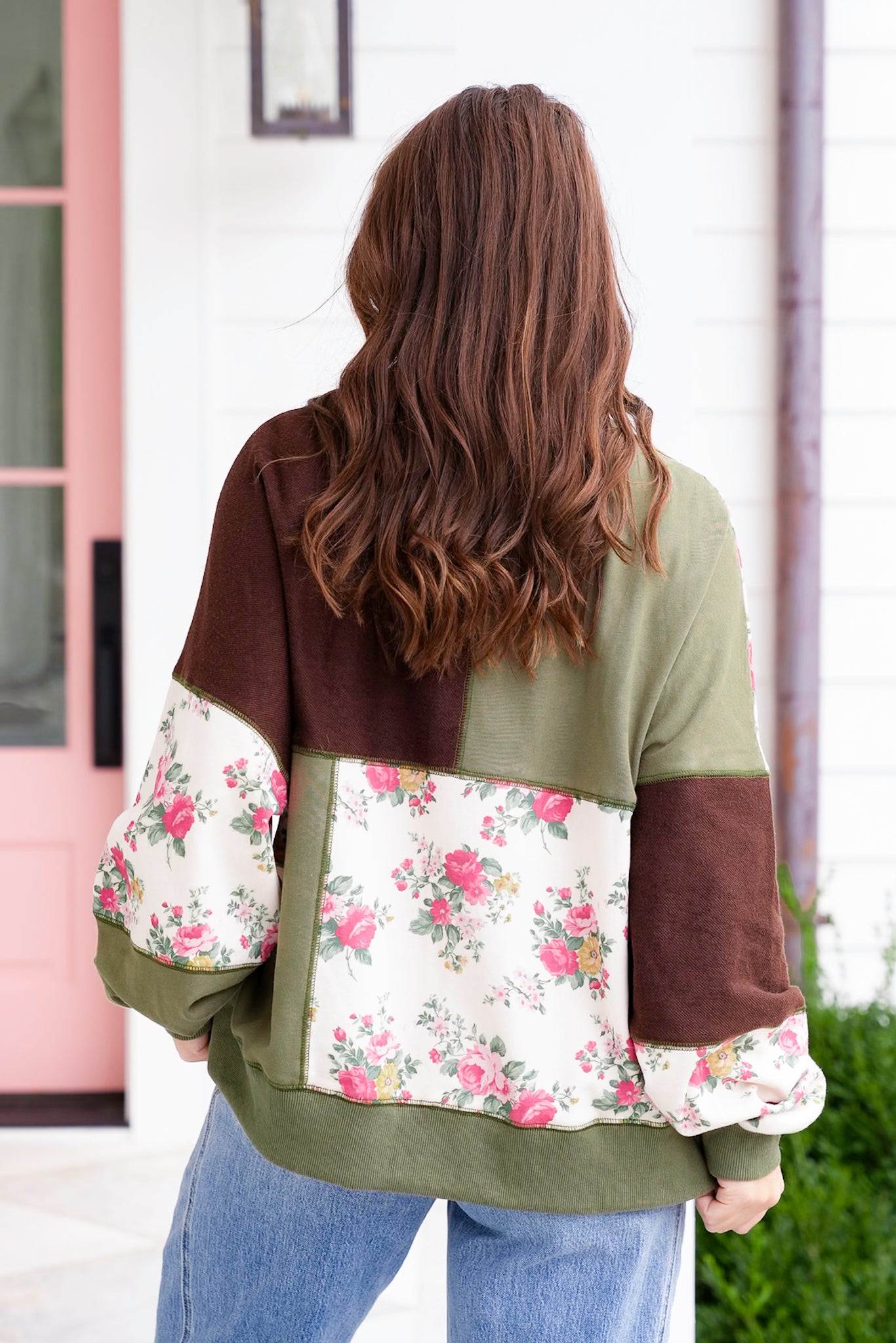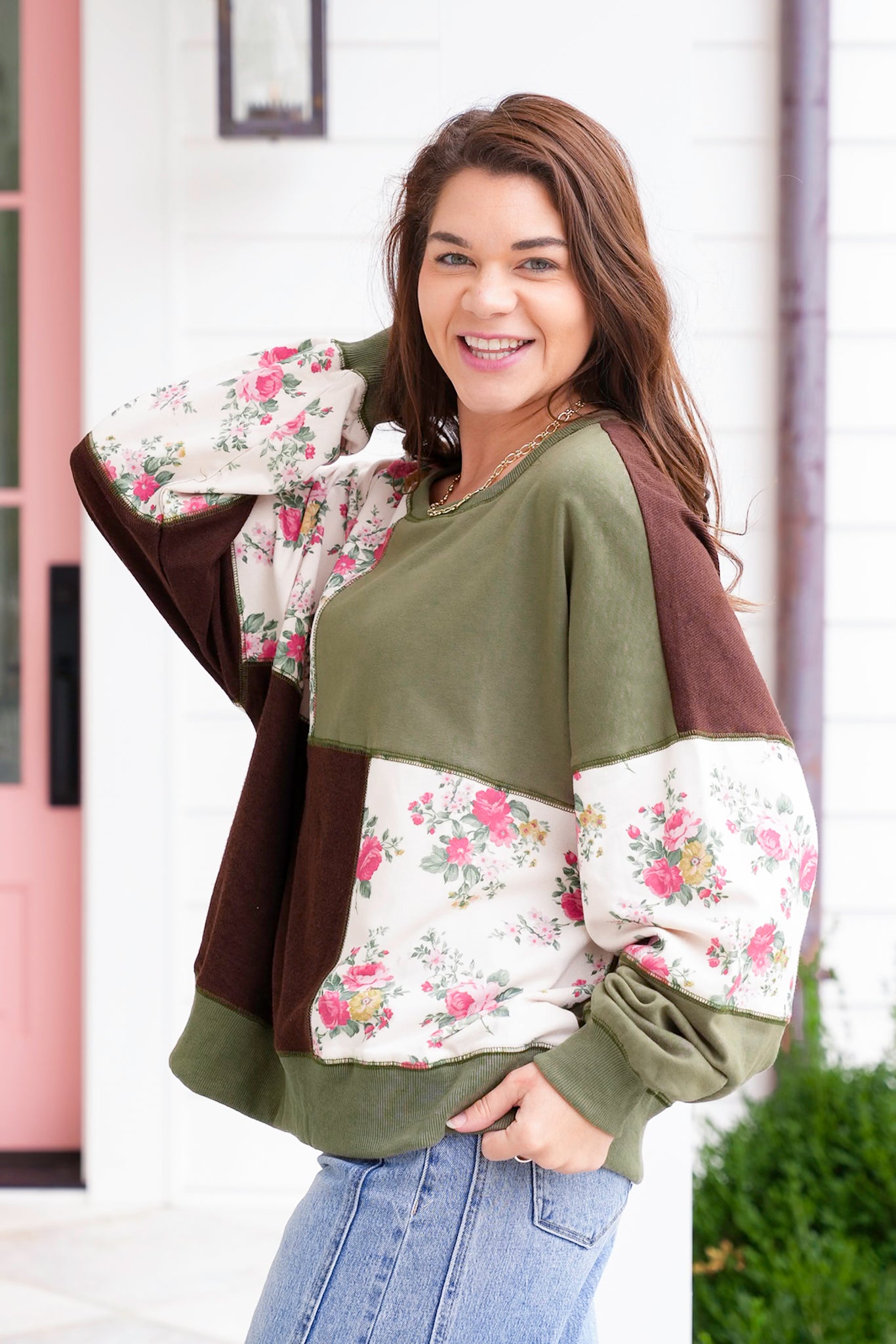 This patchwork pullover brings cozy comfort with a touch of charm. The mix of earthy tones and floral prints gives it that fun, one-of-a-kind vibe, while the relaxed silhouette makes it an easy everyday favorite. Pair it with denim for a laid-back weekend look or layer it over leggings for the ultimate comfy day outfit.
