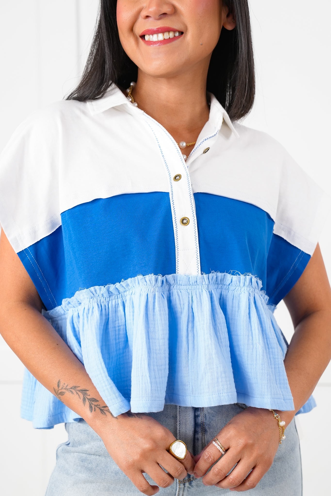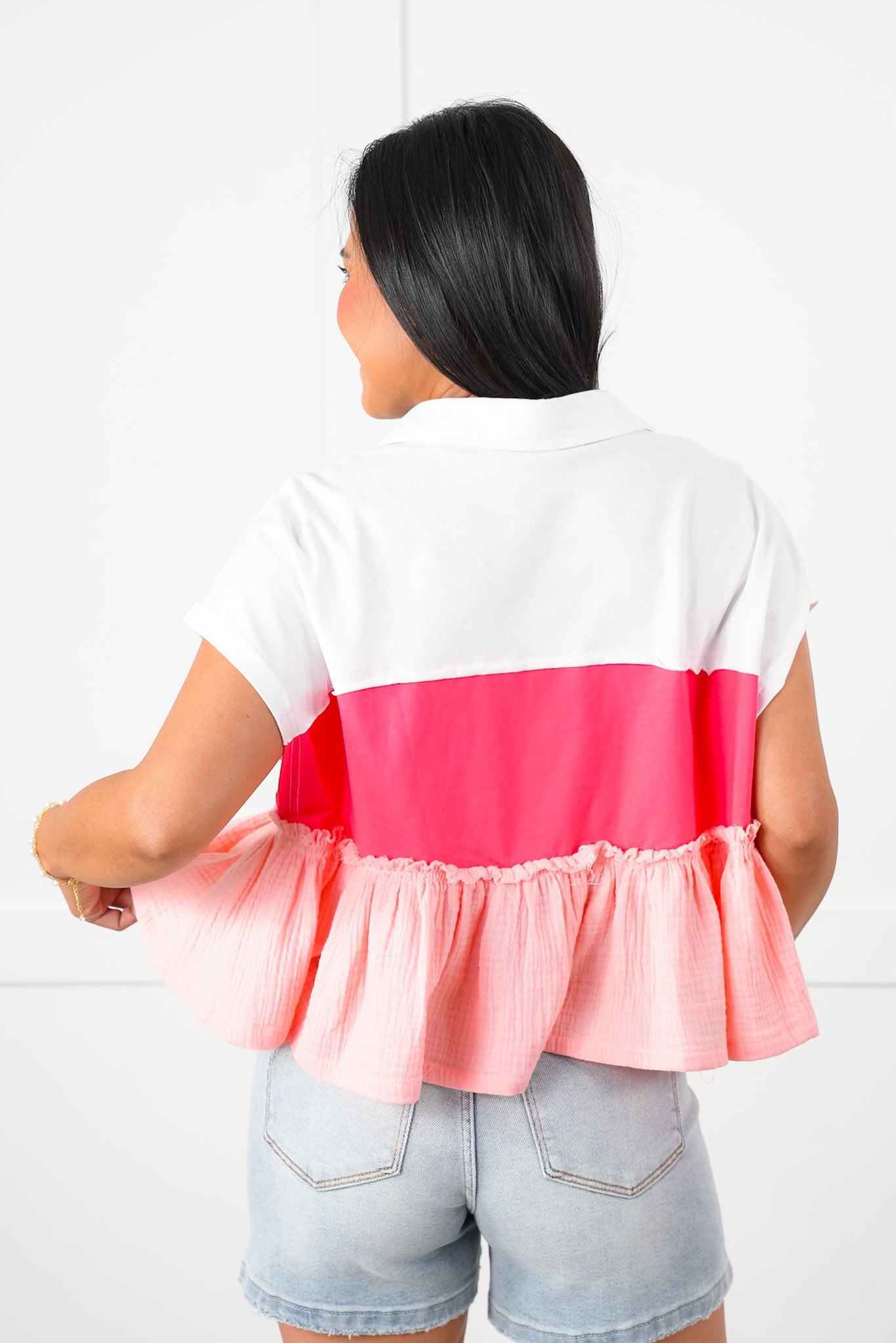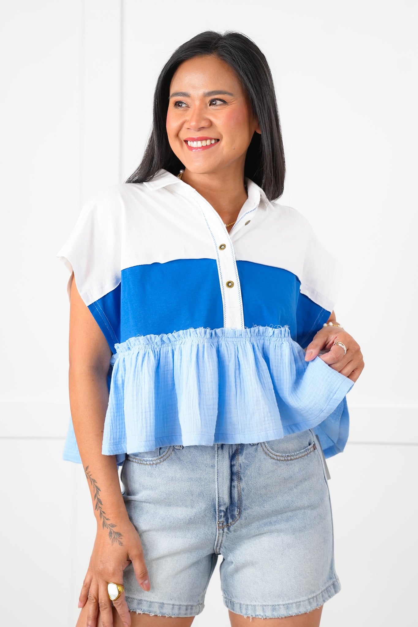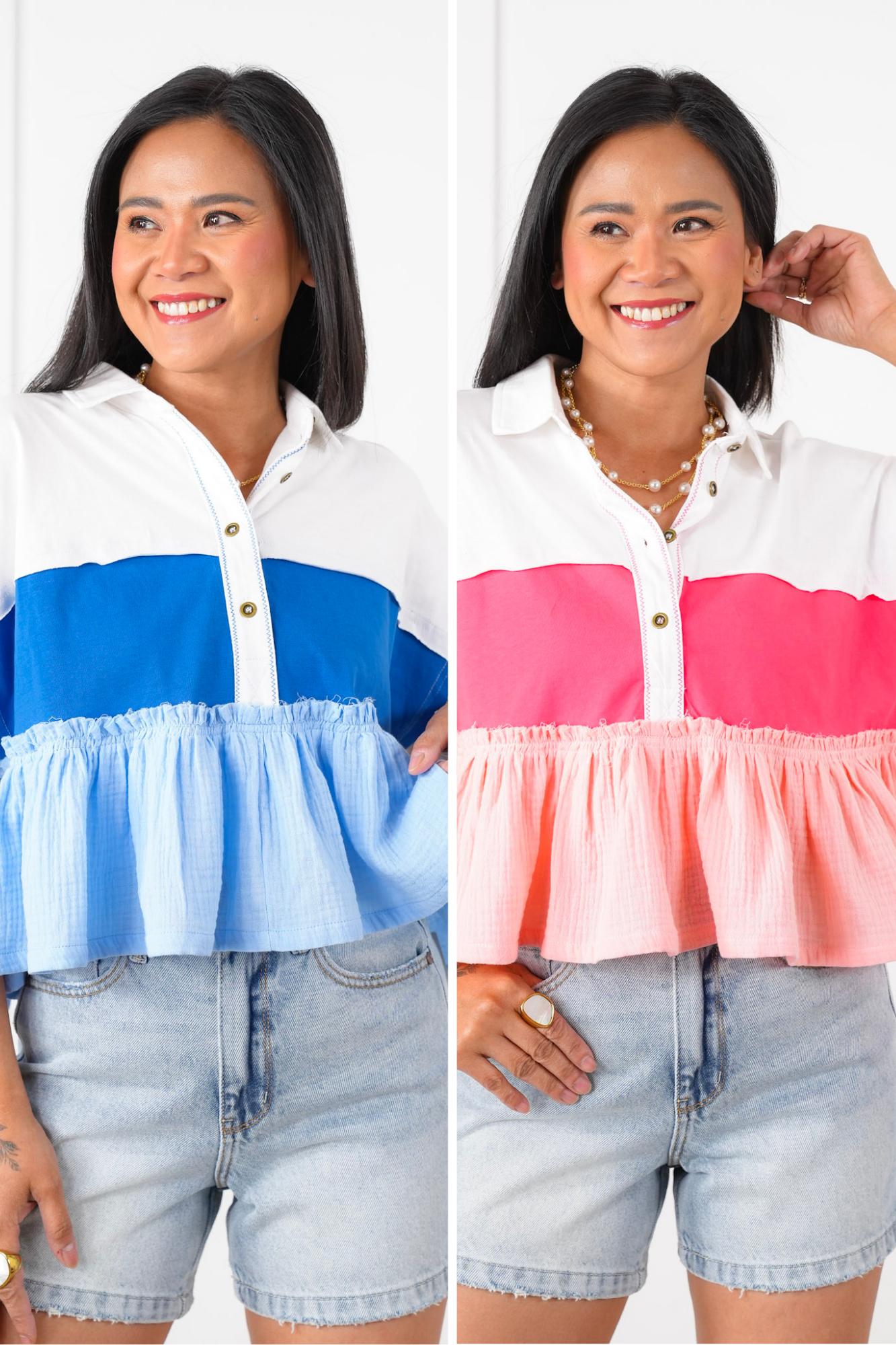 This top is as playful as it is stylish! The color block design paired with the ruffled hem gives it a fun, feminine touch, perfect for a day out or casual office wear. Dress it up with your favorite jeans or pair it with a skirt for a laid-back yet stylish look.