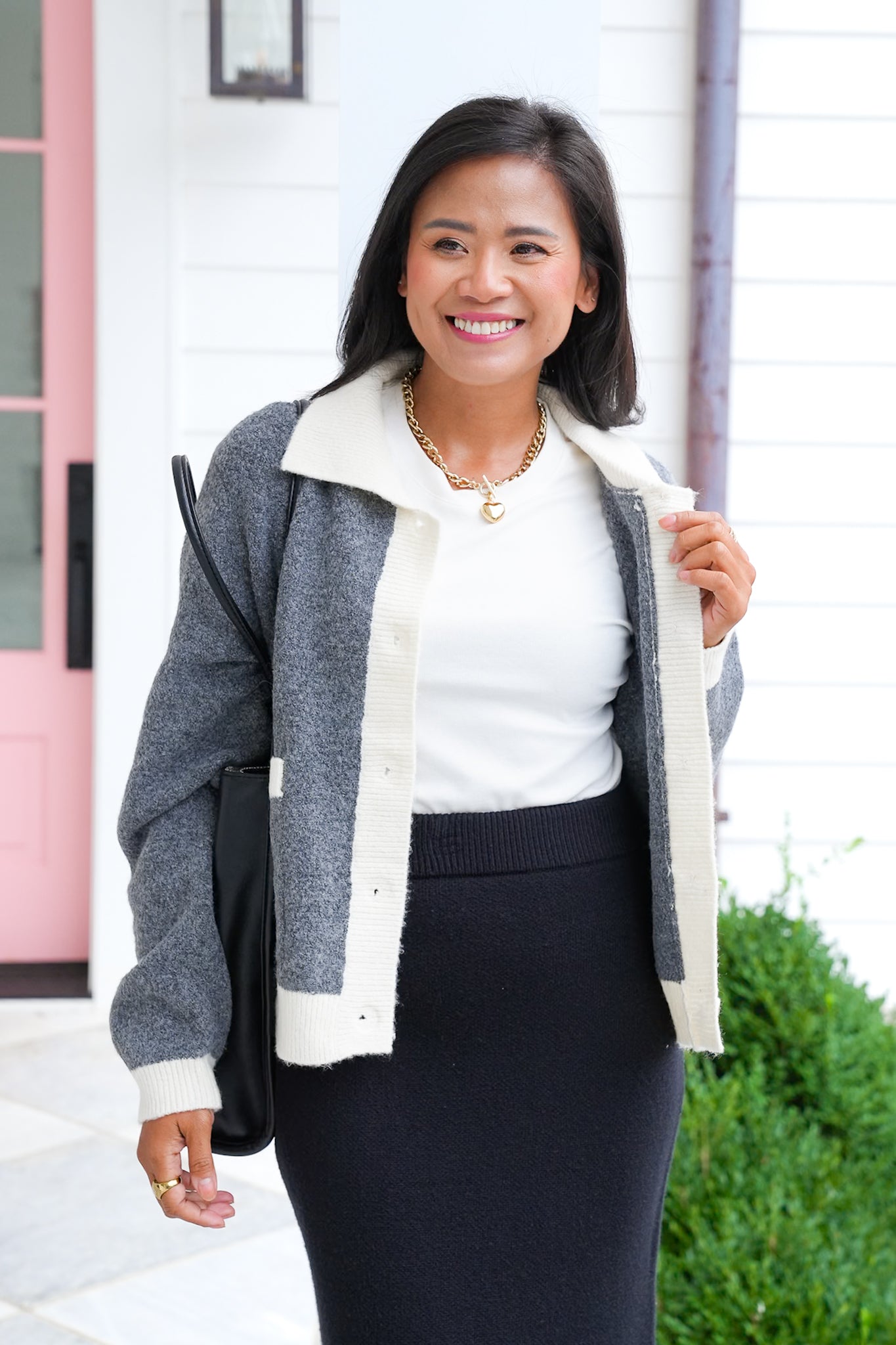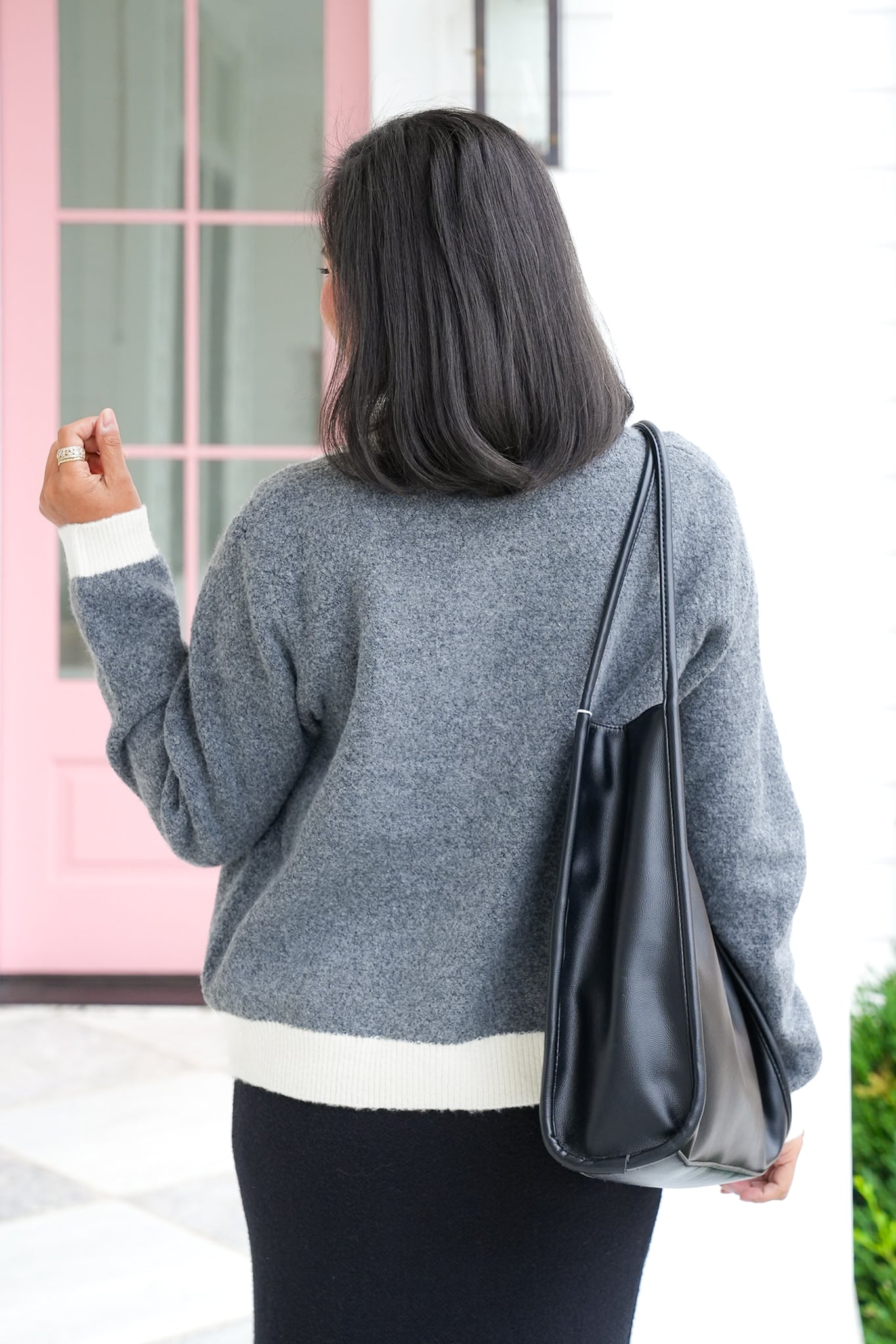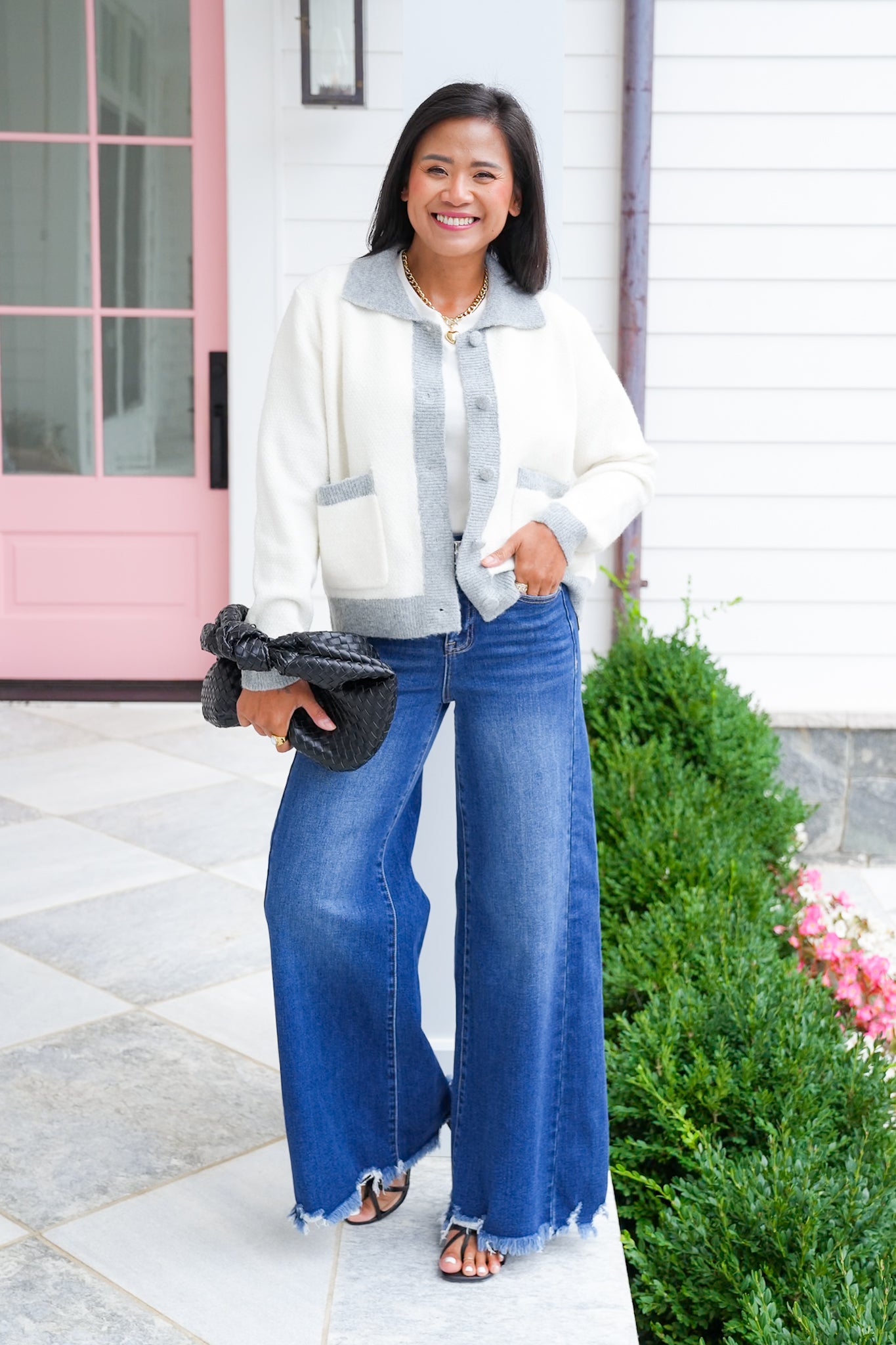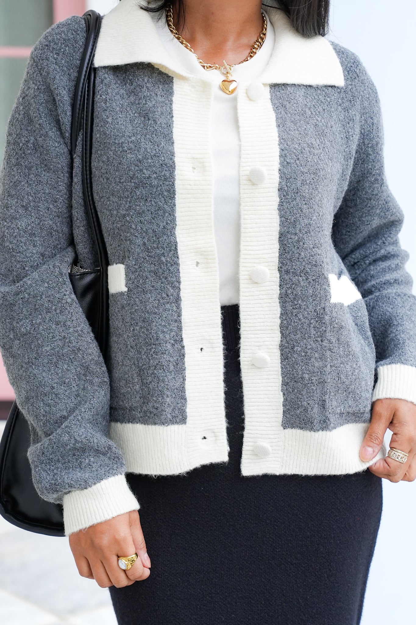 This cardigan is the perfect mix of cozy and refined, with a classic silhouette that can easily dress up your everyday denim or pair with skirts for something a little more elevated. The contrast trim and collar add a touch of sophistication, while the knit-covered buttons keep it feeling chic and unique.