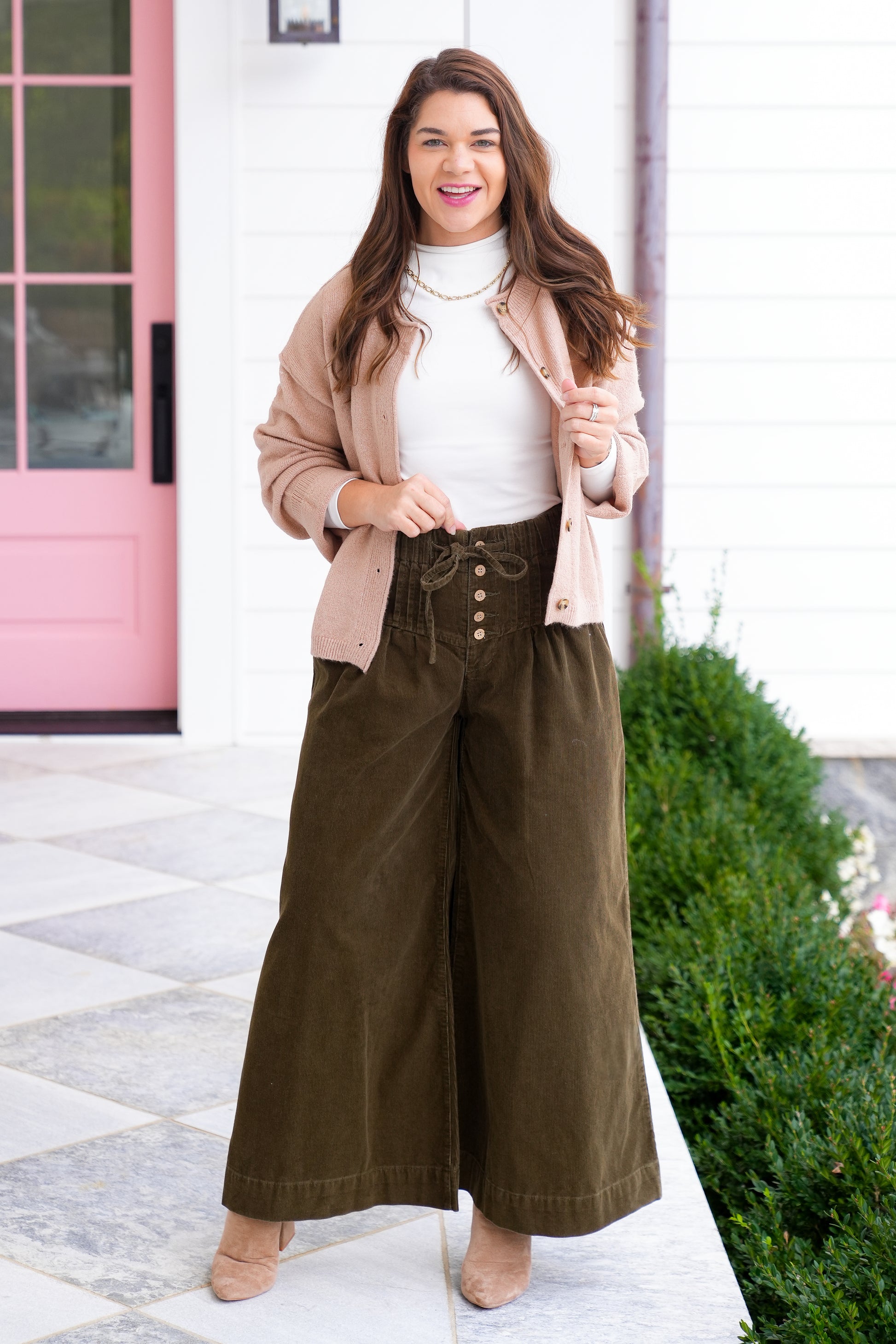 Corduroy Elastic Waist Button Fly Wide Leg Pants