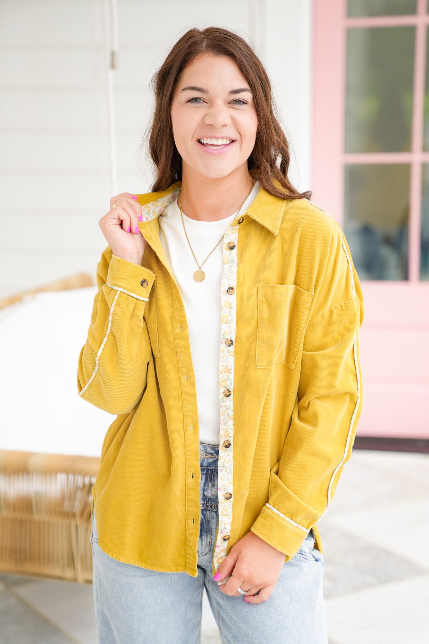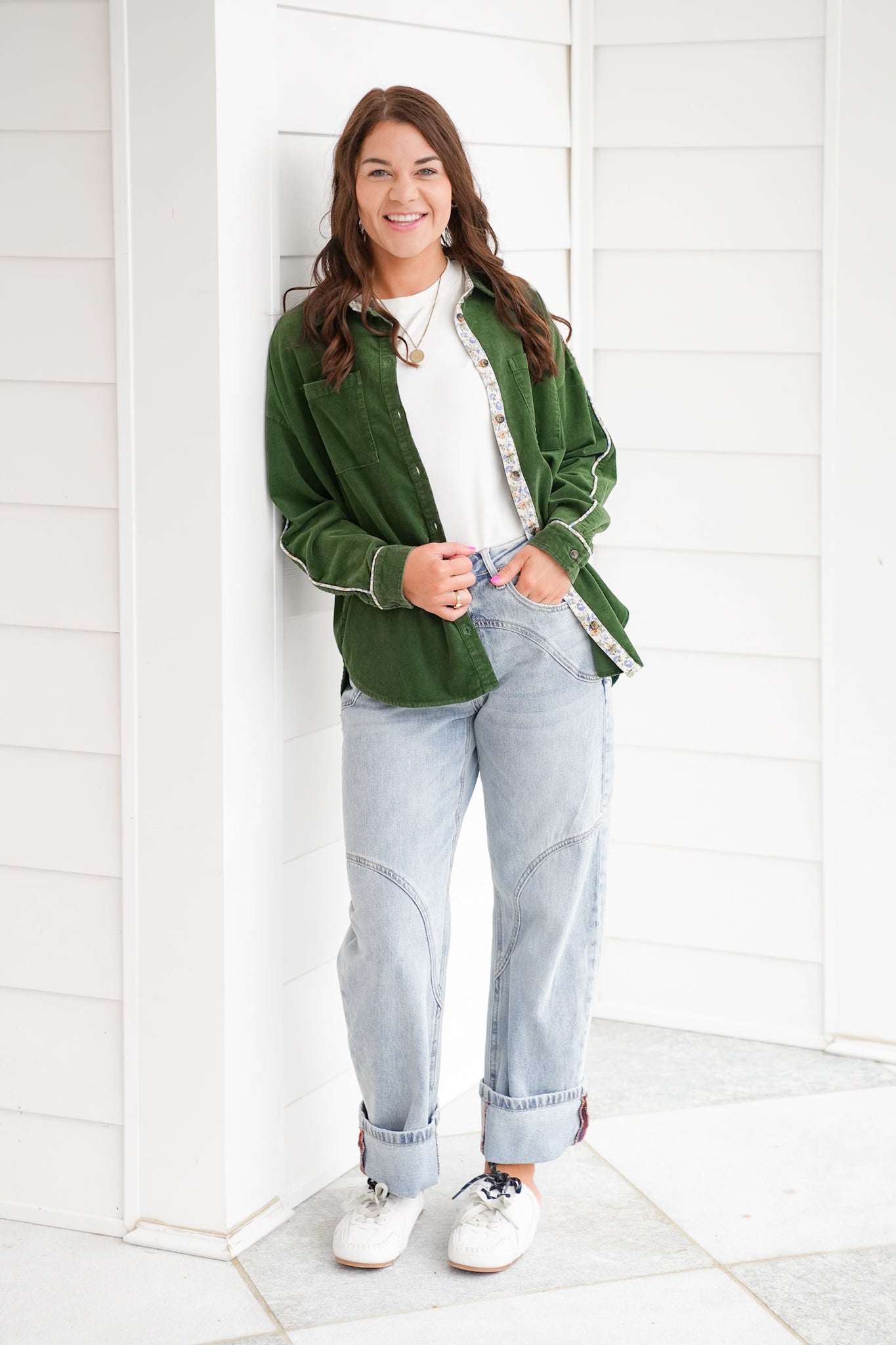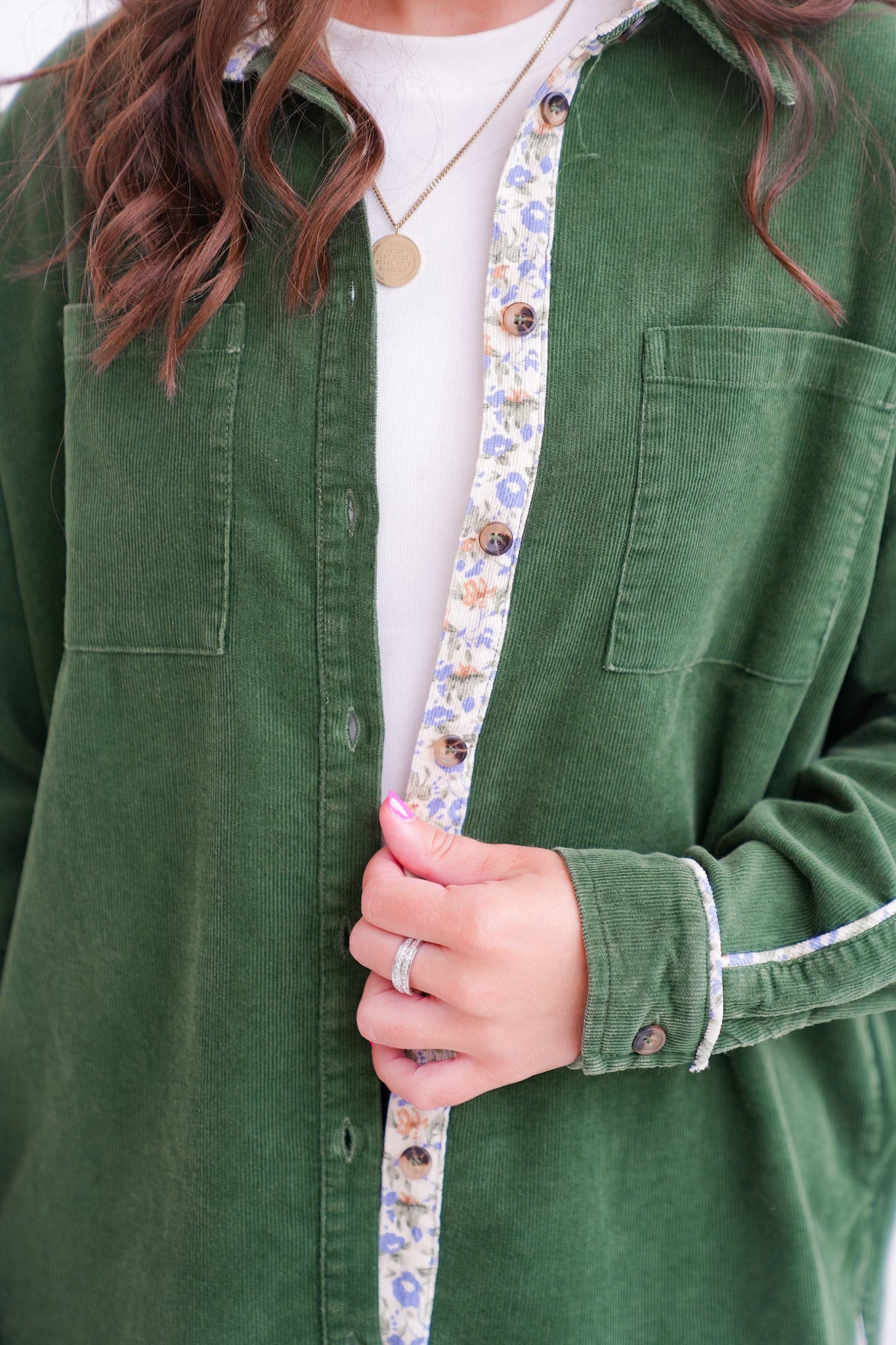 Corduroy Long Sleeve Button Down Top with Floral Detail