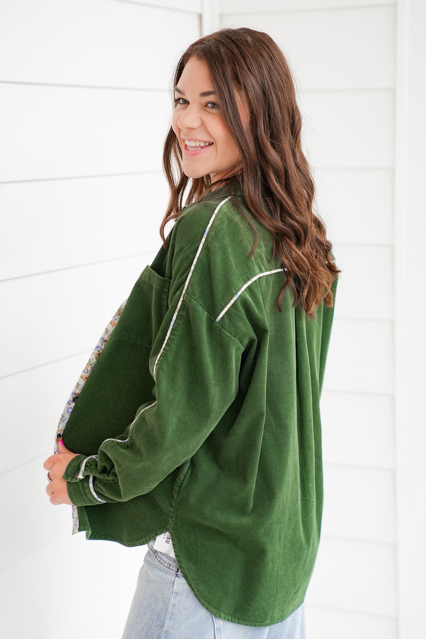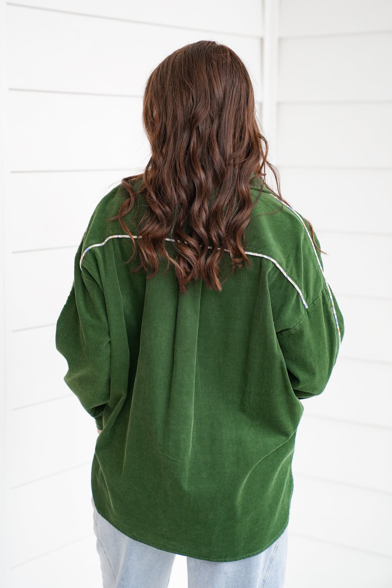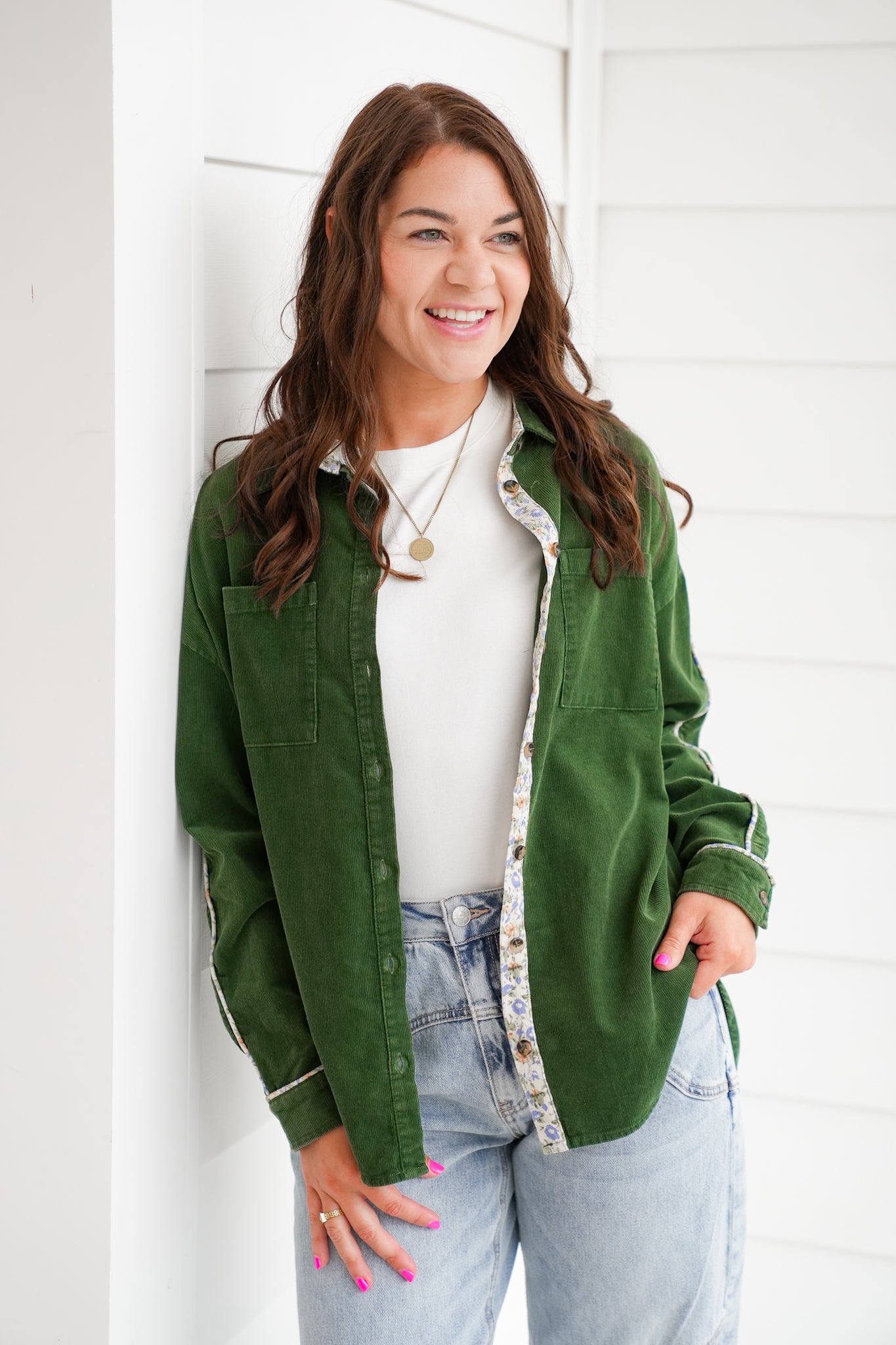 Corduroy Long Sleeve Button Down Top with Floral Detail