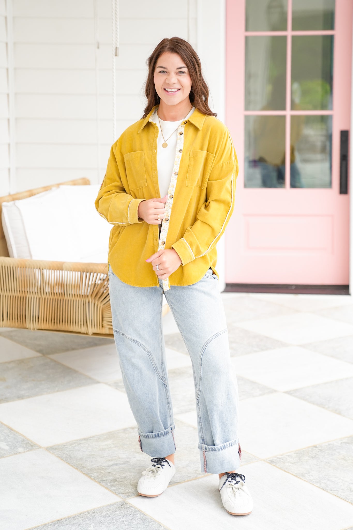This corduroy button-down is your cozy-meets-chic essential. The floral accents give it a playful, unexpected touch that looks great layered over a graphic tee or buttoned up with jeans. Roll the sleeves to show off the floral lining and pair with ankle boots for a polished fall-ready outfit.
