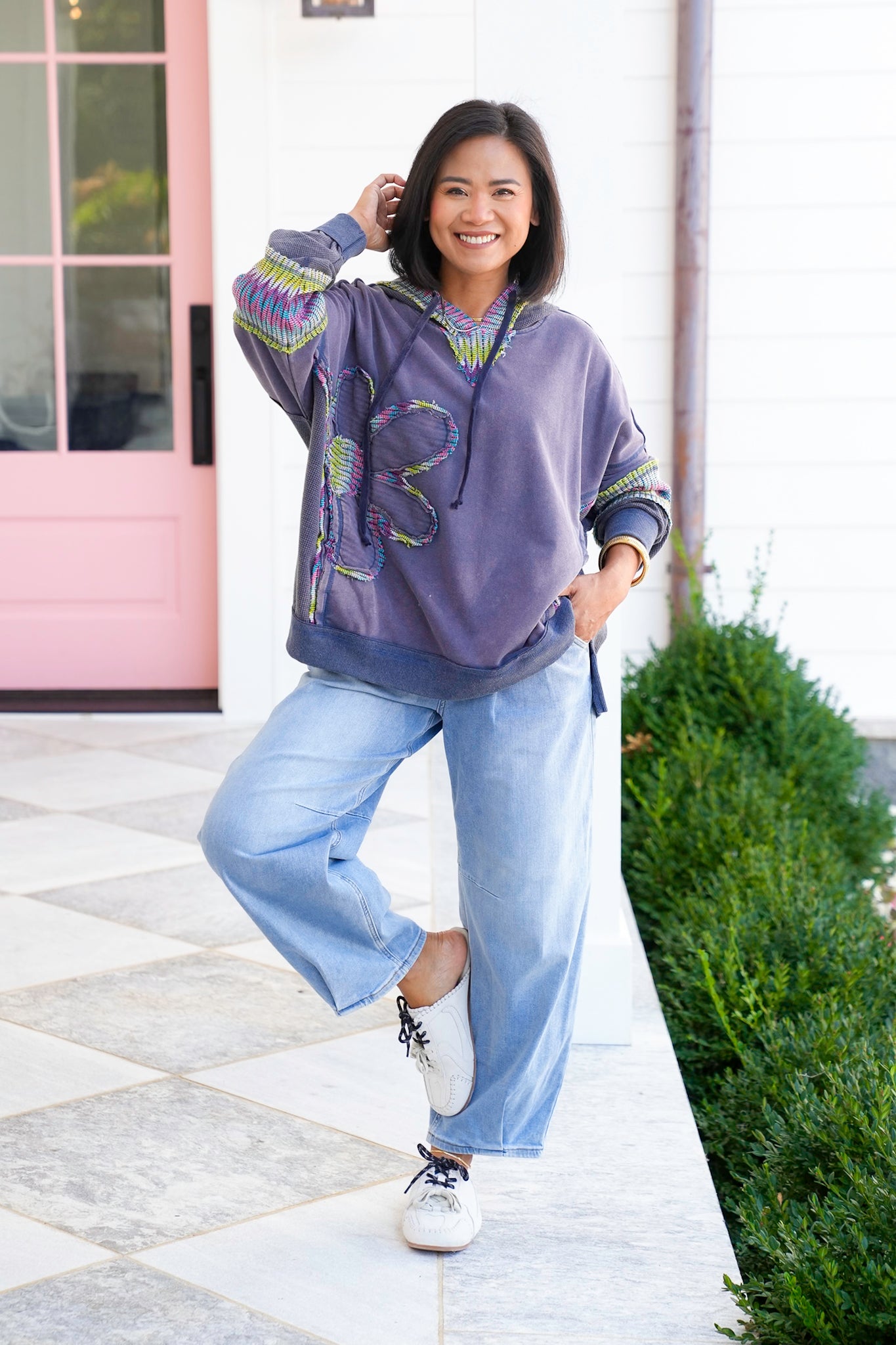 This hoodie brings serious vintage energy! The garment-washed finish and colorful woven daisy appliqué give it that one-of-a-kind artisan feel. Every detail, from the contrast knit trim to the slouchy cut, makes it perfect for layering with jeans or leggings. Throw it on for weekend adventures or chilly evenings and watch the compliments roll in.