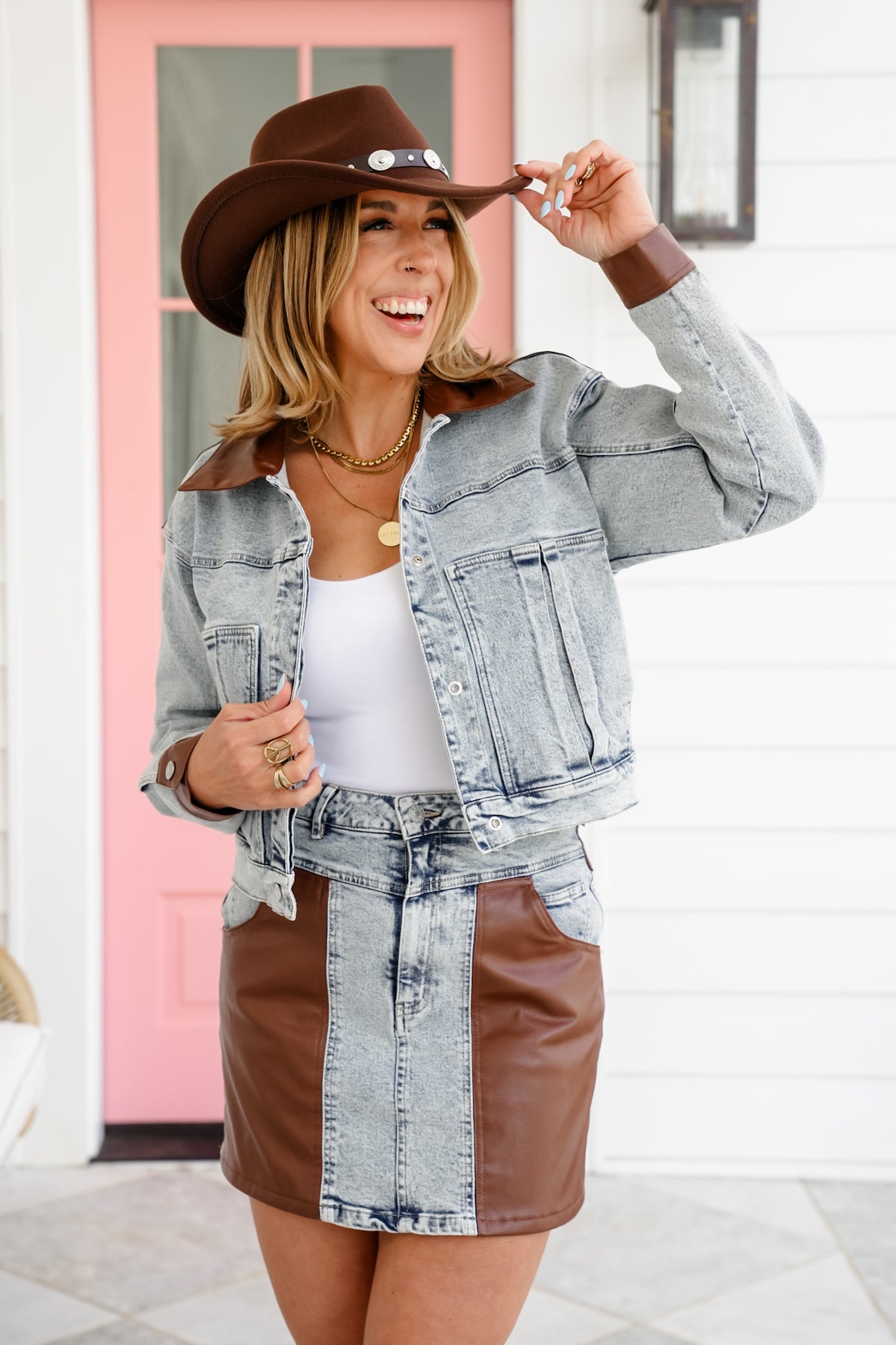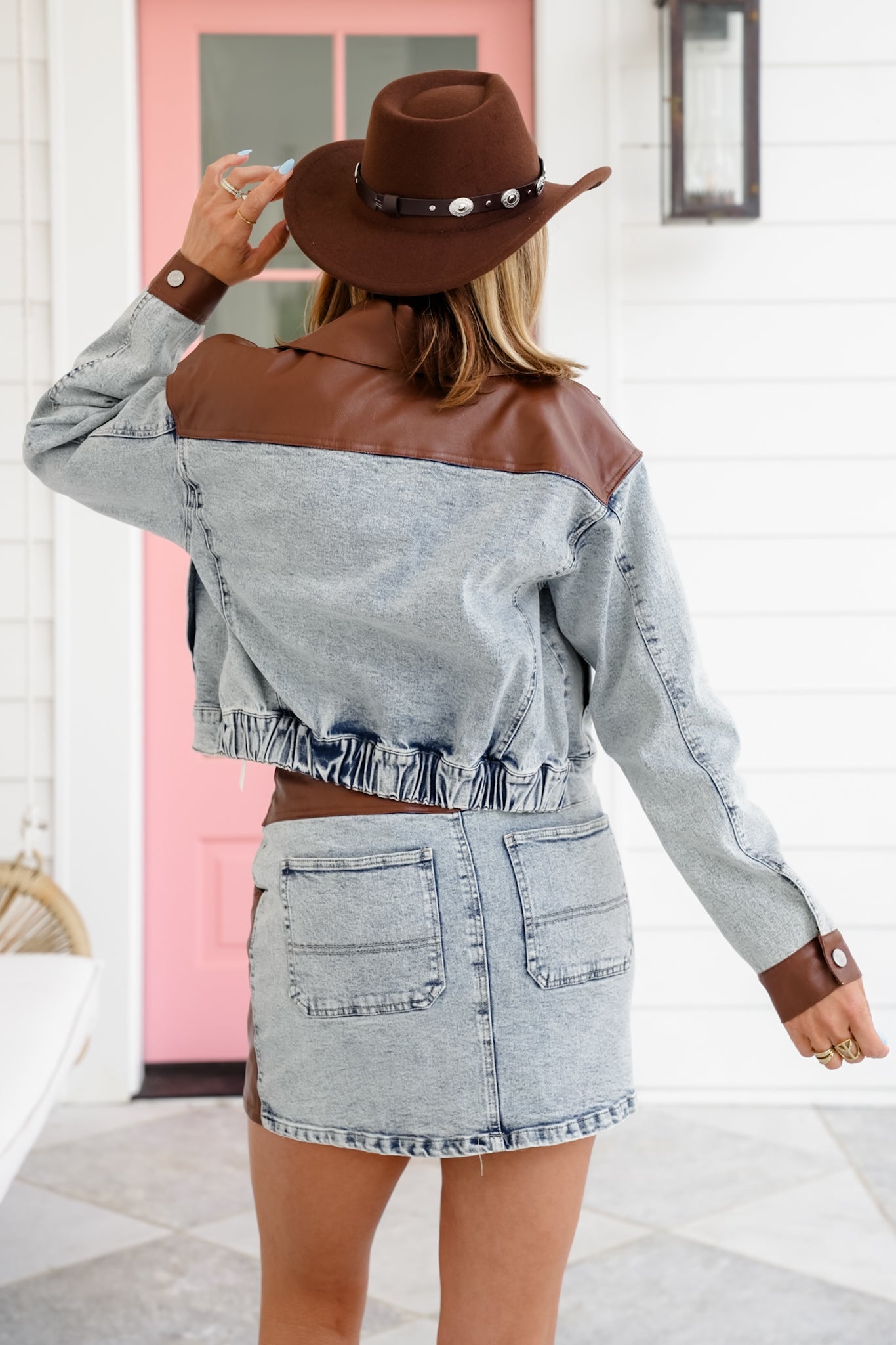 Talk about a showstopper. This light-wash denim jacket gets a glow-up with brown vegan leather trim at the cuffs, collar, and back yoke. Whether you're rockin' it solo or styling with the matching skirt, this one's guaranteed to spark compliments.