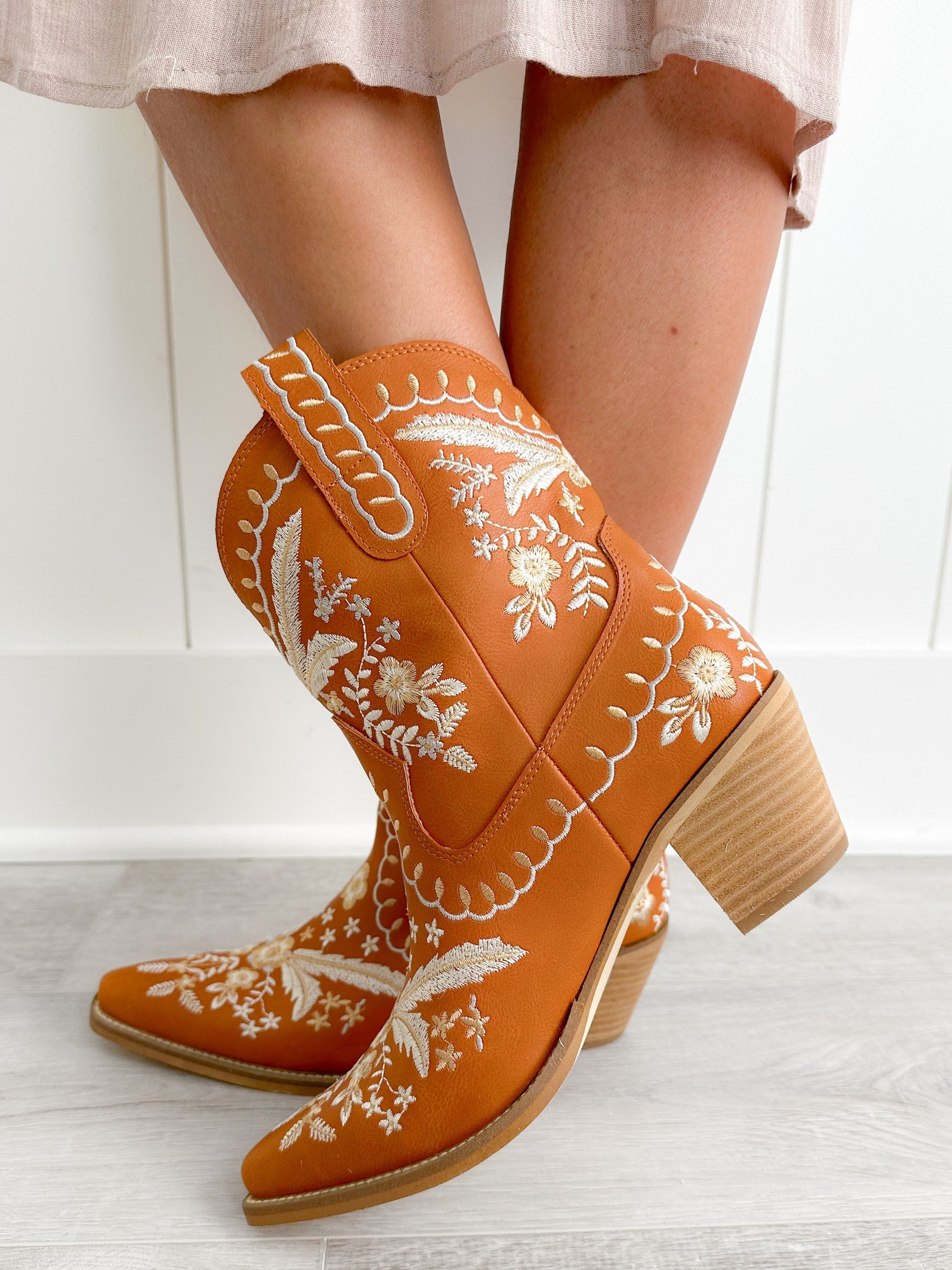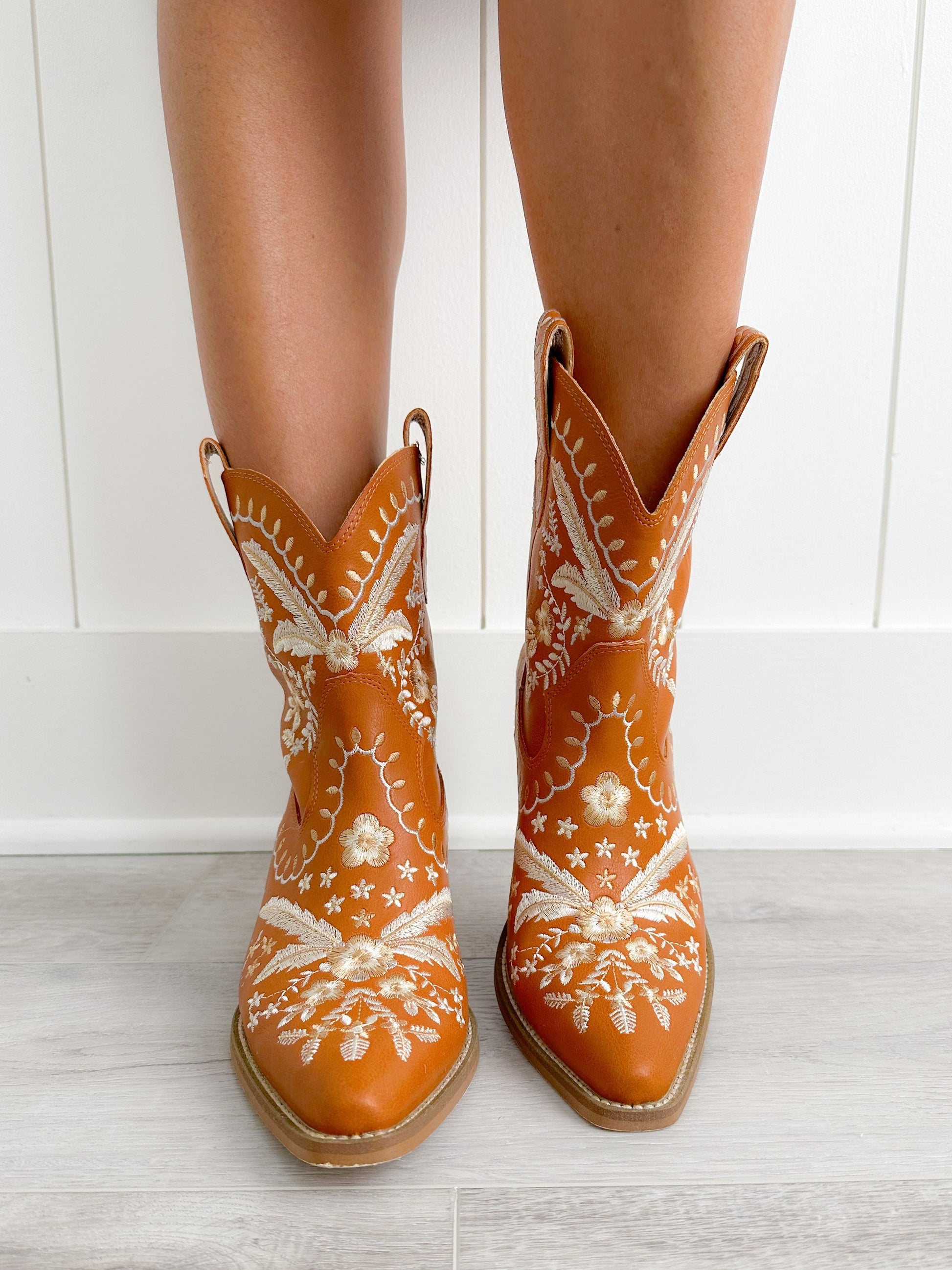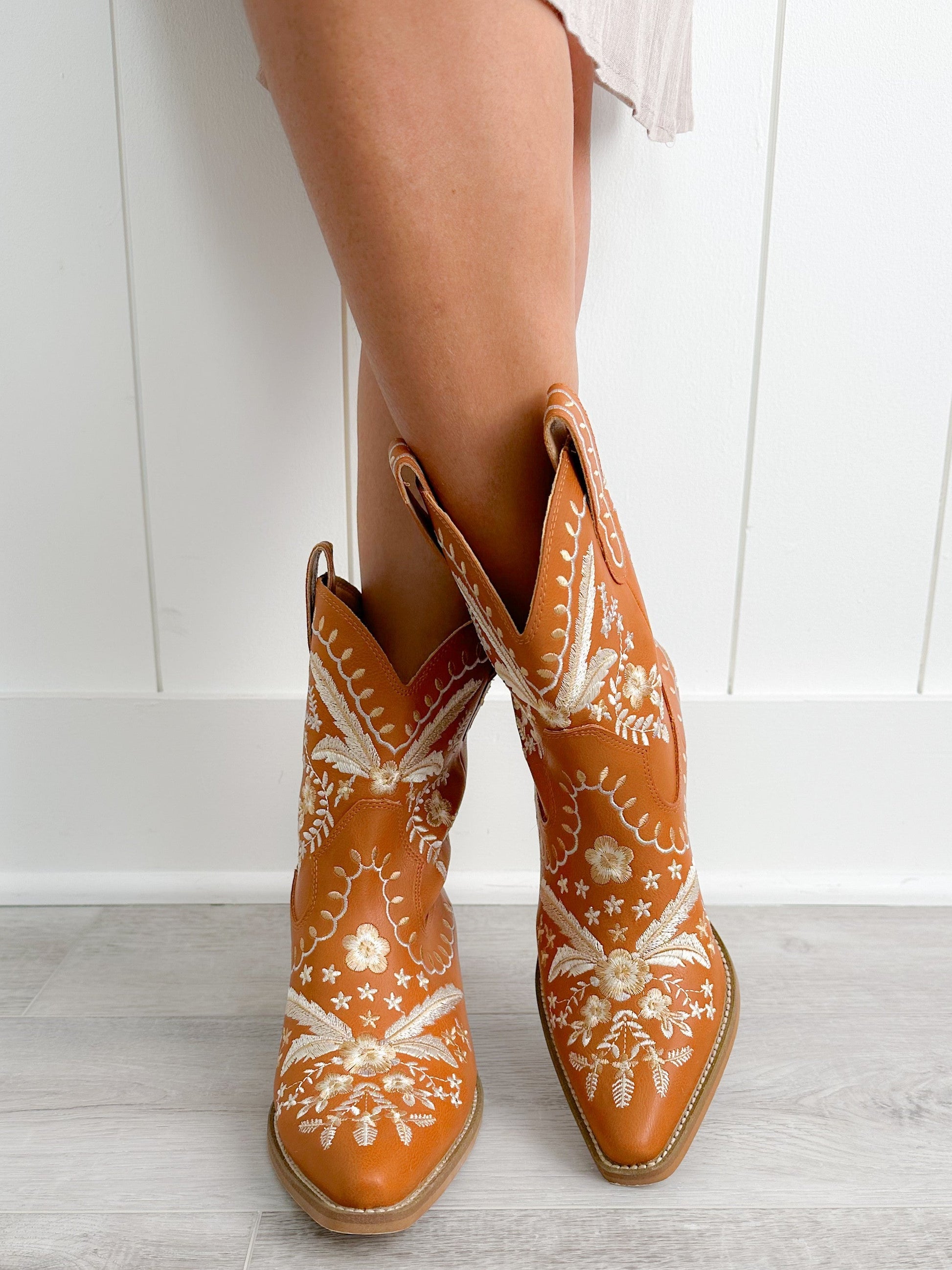 Add a little western charm to your every step with these beautifully stitched round toe boots. The warm saddle tone pops with creamy floral embroidery, making them a standout with everything from denim cutoffs to boho dresses. Style them with a flowy midi skirt or a graphic tee and flares for that effortlessly cool cowgirl vibe.