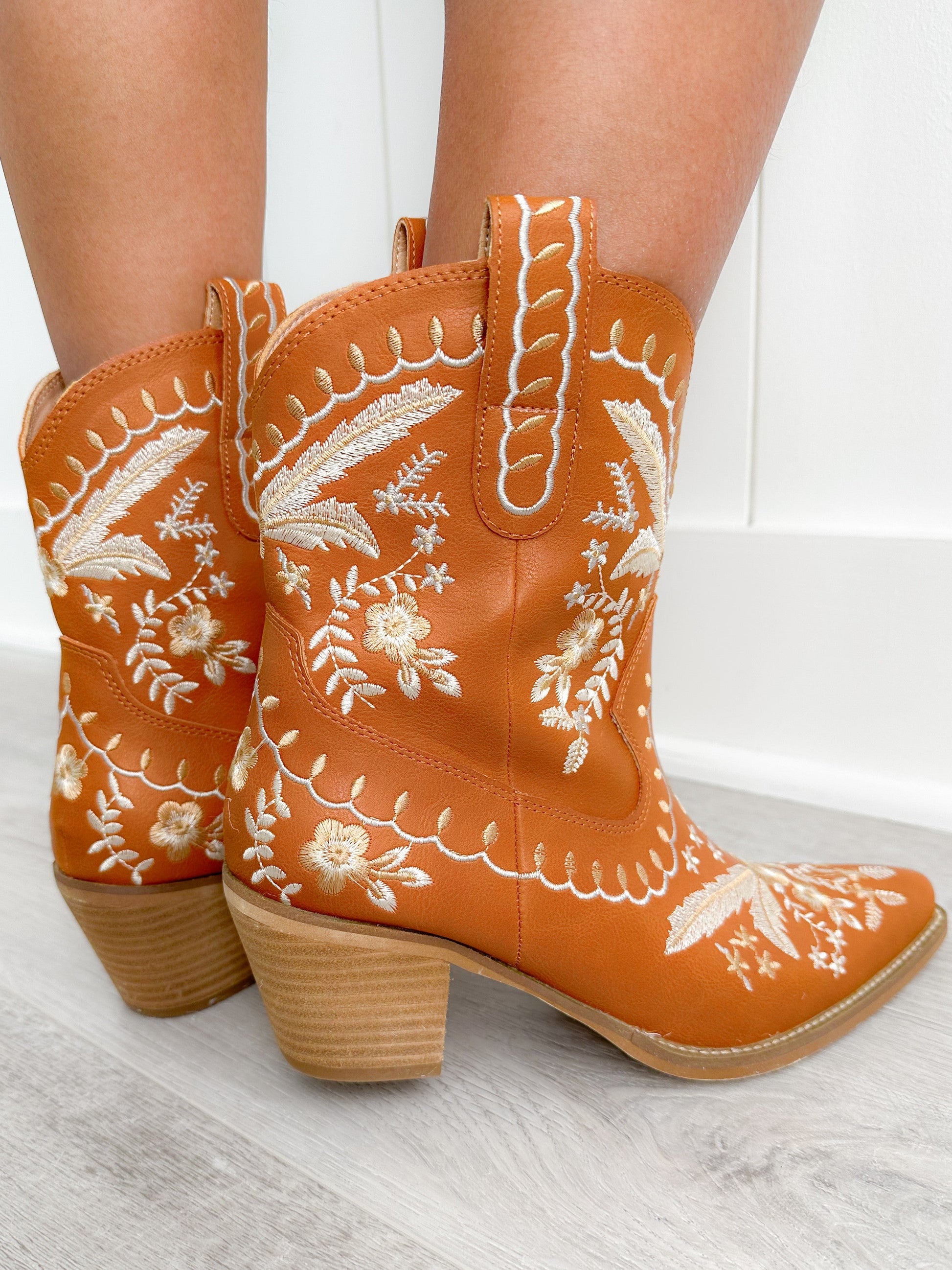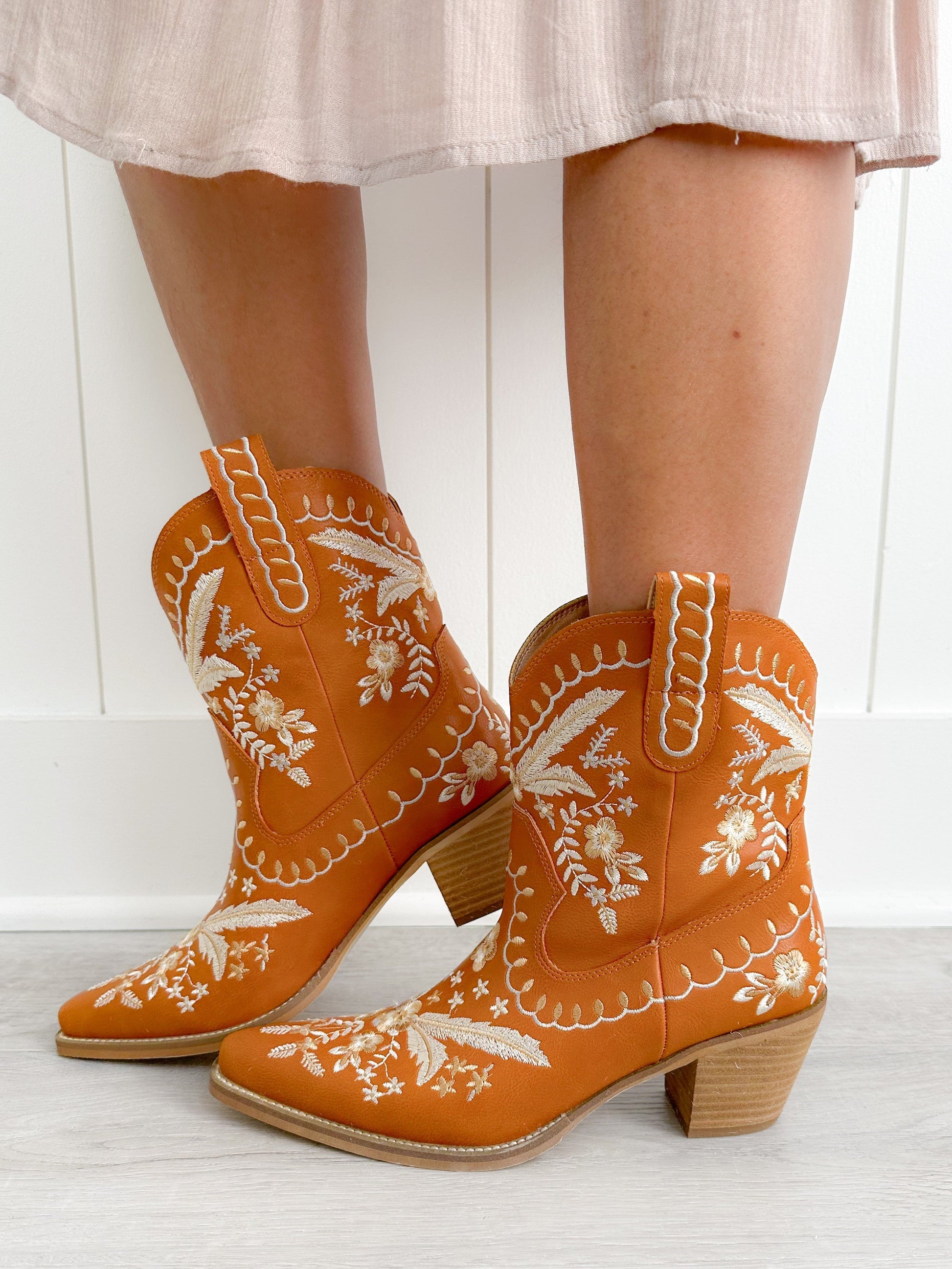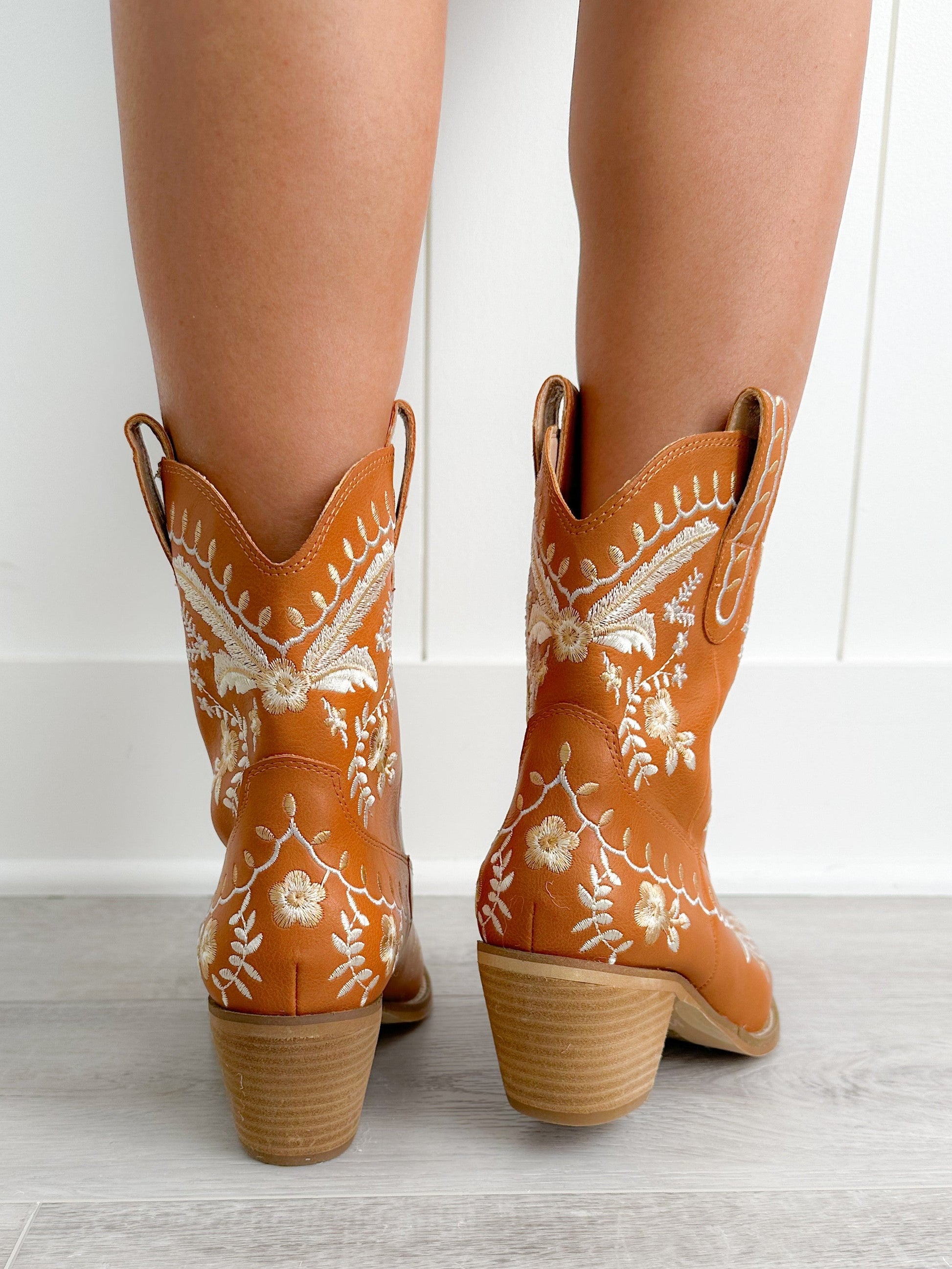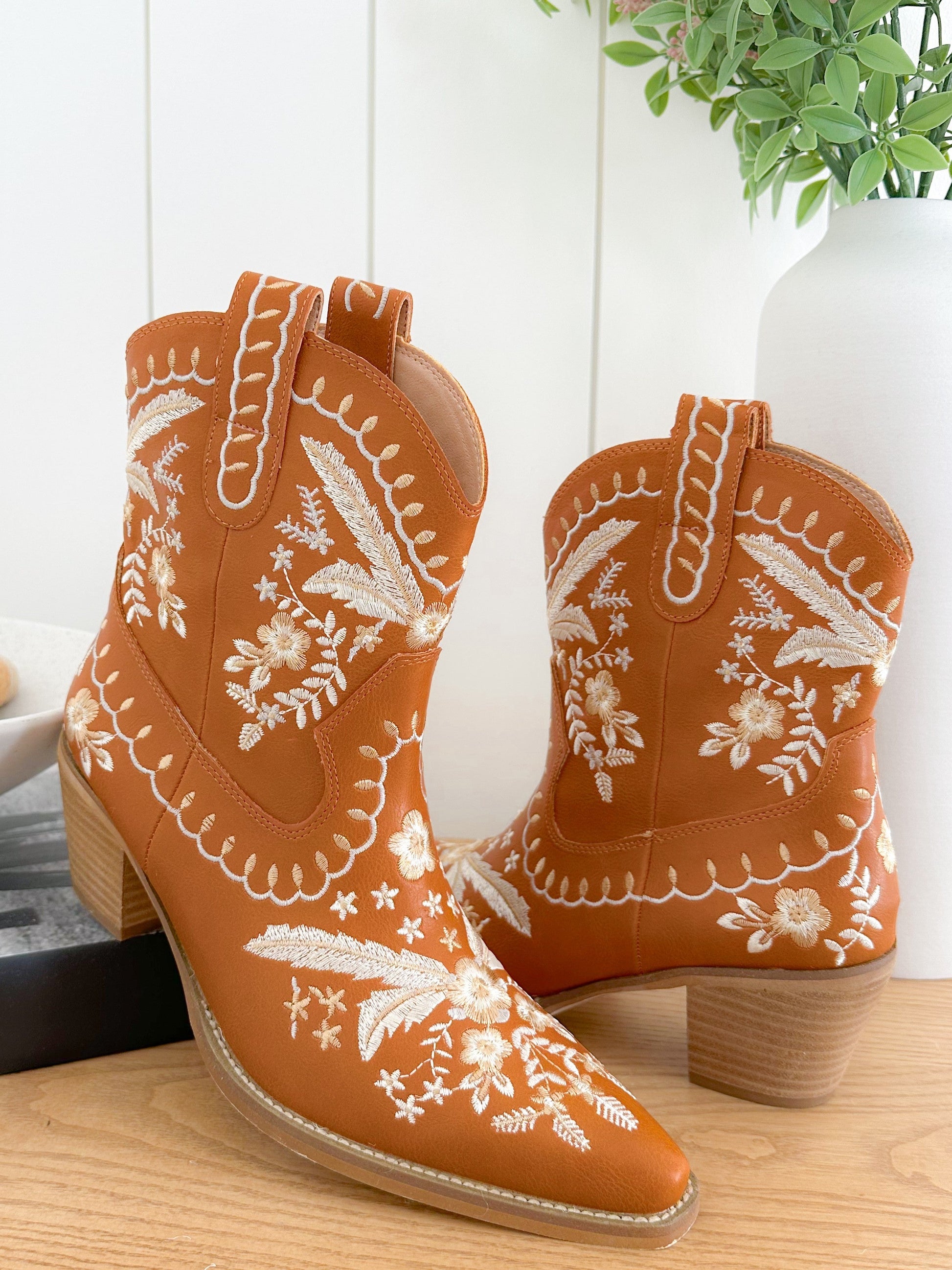 Add a little western charm to your every step with these beautifully stitched round toe boots. The warm saddle tone pops with creamy floral embroidery, making them a standout with everything from denim cutoffs to boho dresses. Style them with a flowy midi skirt or a graphic tee and flares for that effortlessly cool cowgirl vibe.