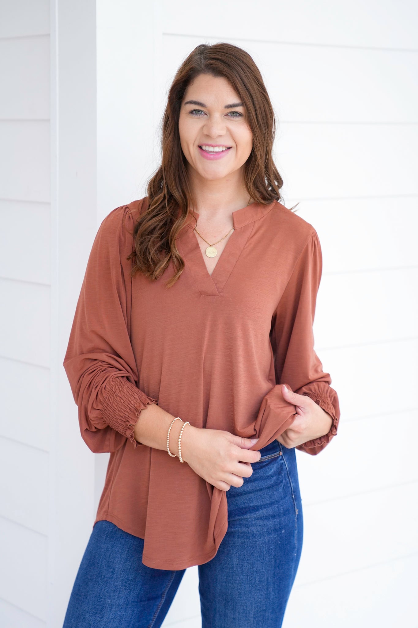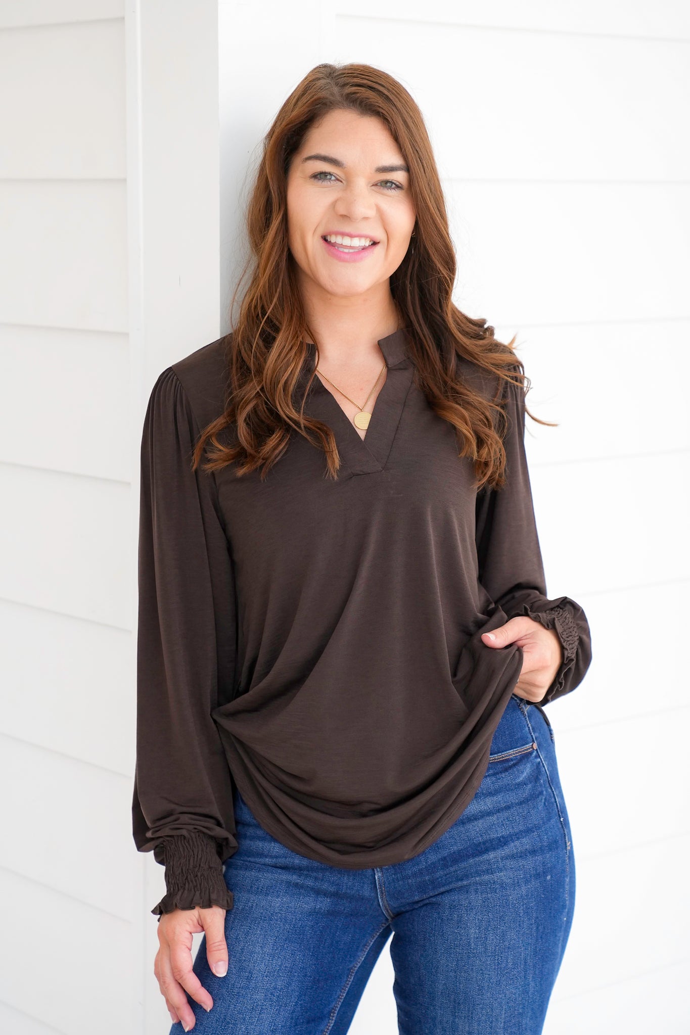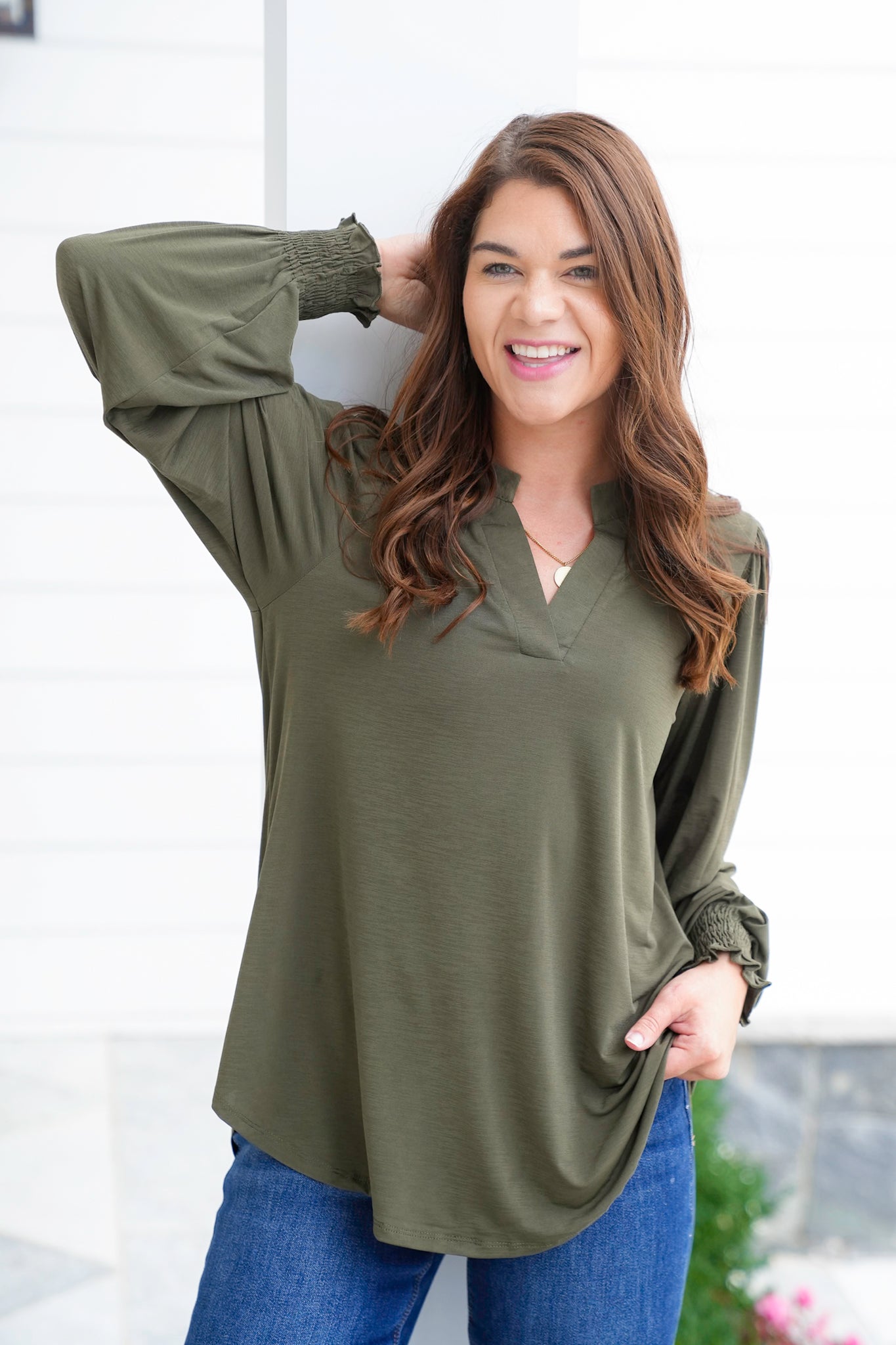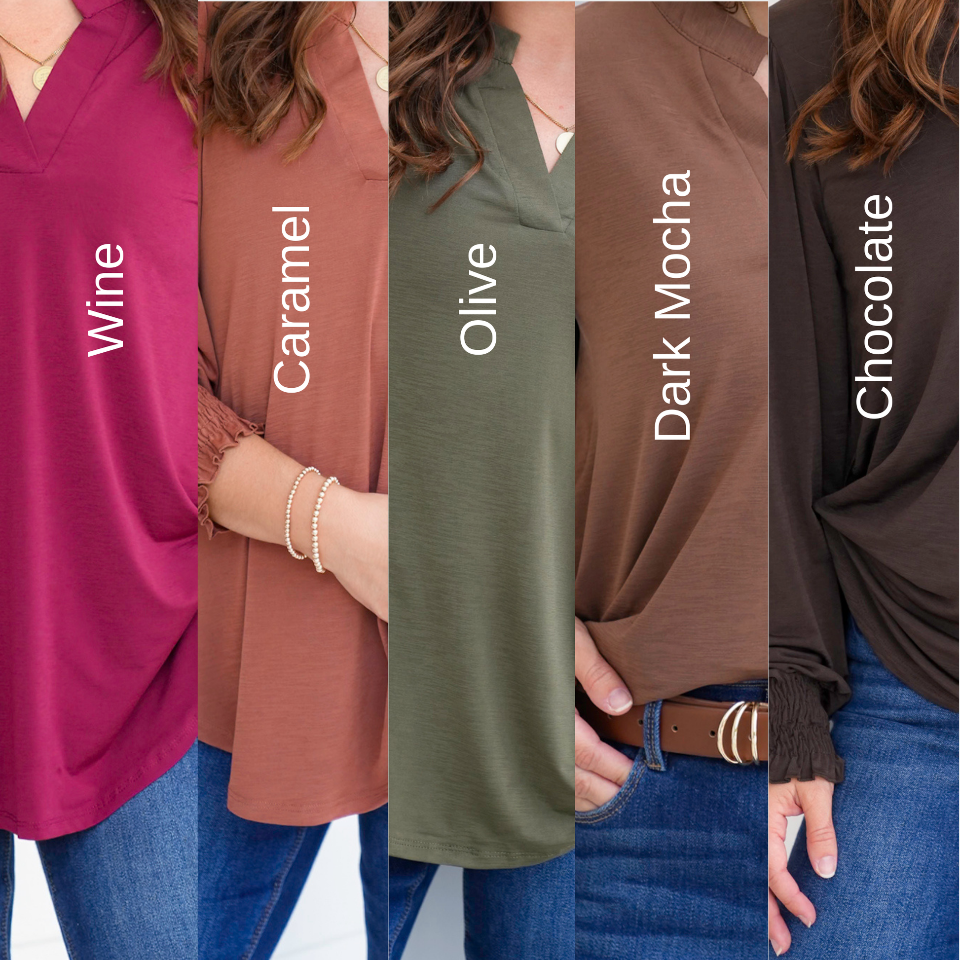 Door Buster! Plus/Reg Solid Long Sleeve Split Neck Tunic Top