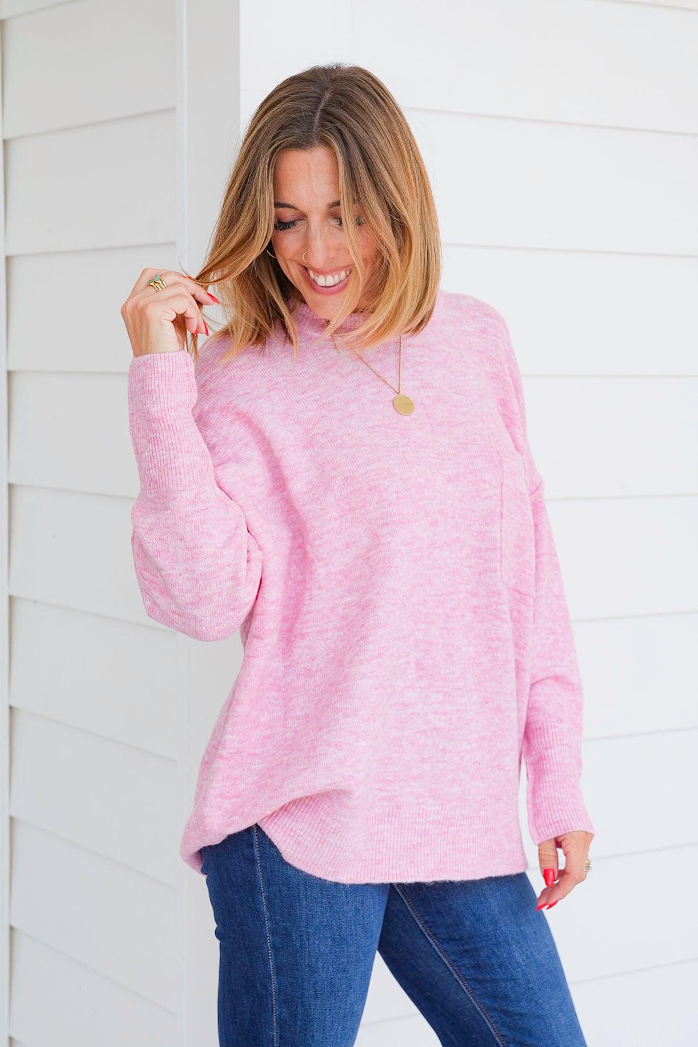 * Oversized hi-low hem for that laidback, slouchy-chic vibe