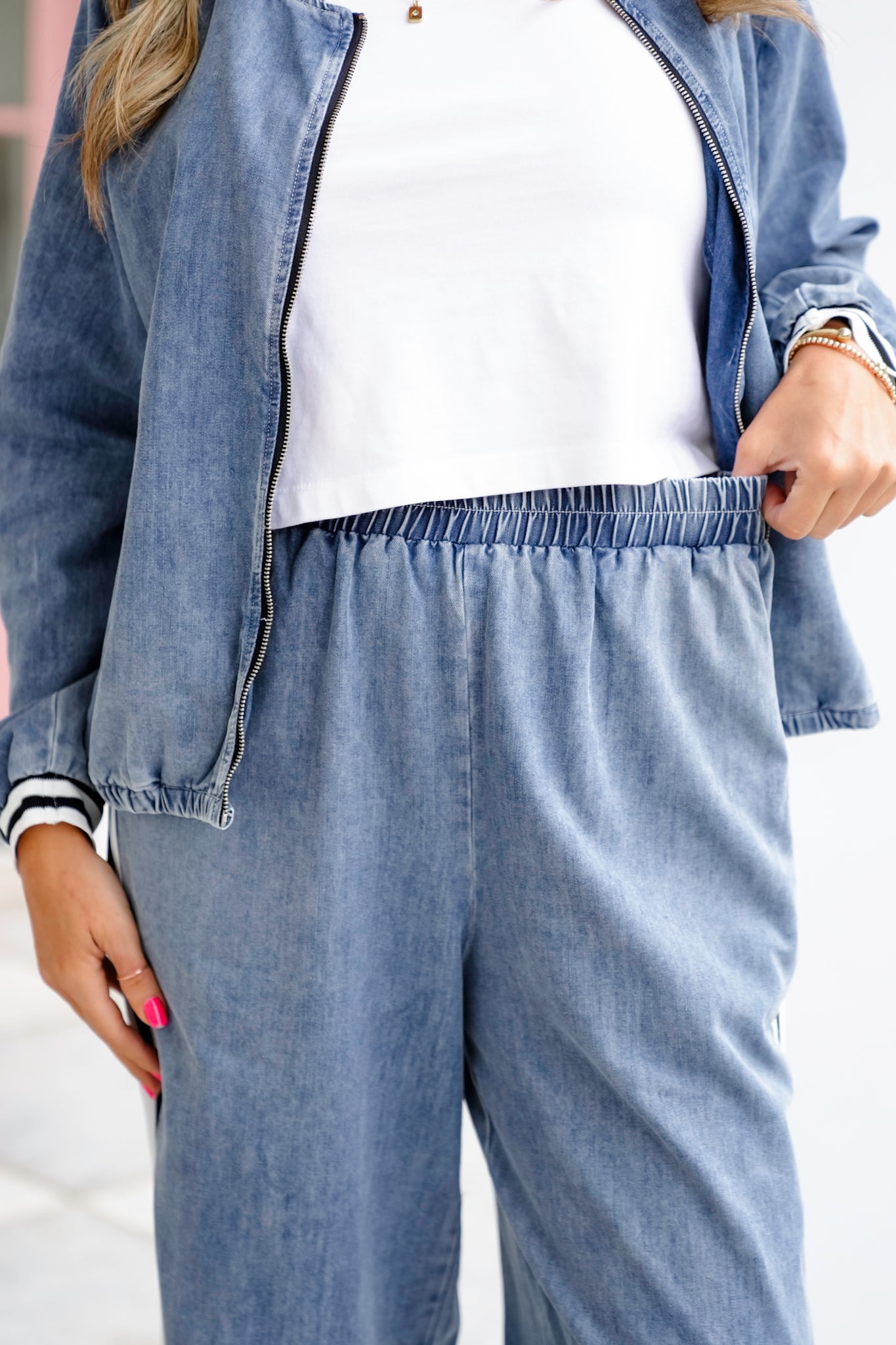 These pants bring a laid-back style with a touch of retro edge. The relaxed, wide-leg design and stripe detail give them an effortlessly cool, athleisure-inspired feel, while the soft, washed texture keeps them comfortable all day long. Perfect for lounging, errands, or pairing with the matching jacket for a coordinated, polished set.