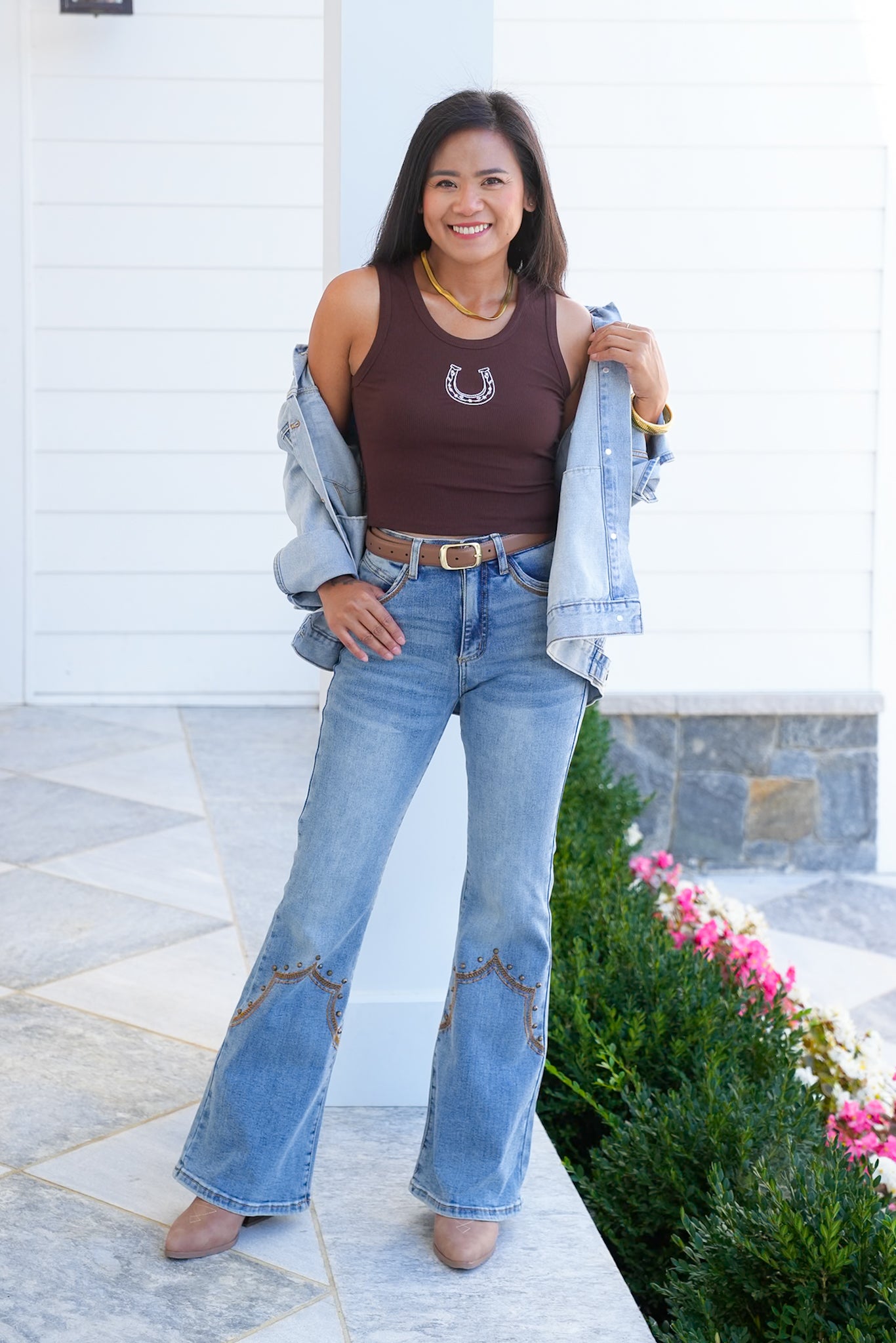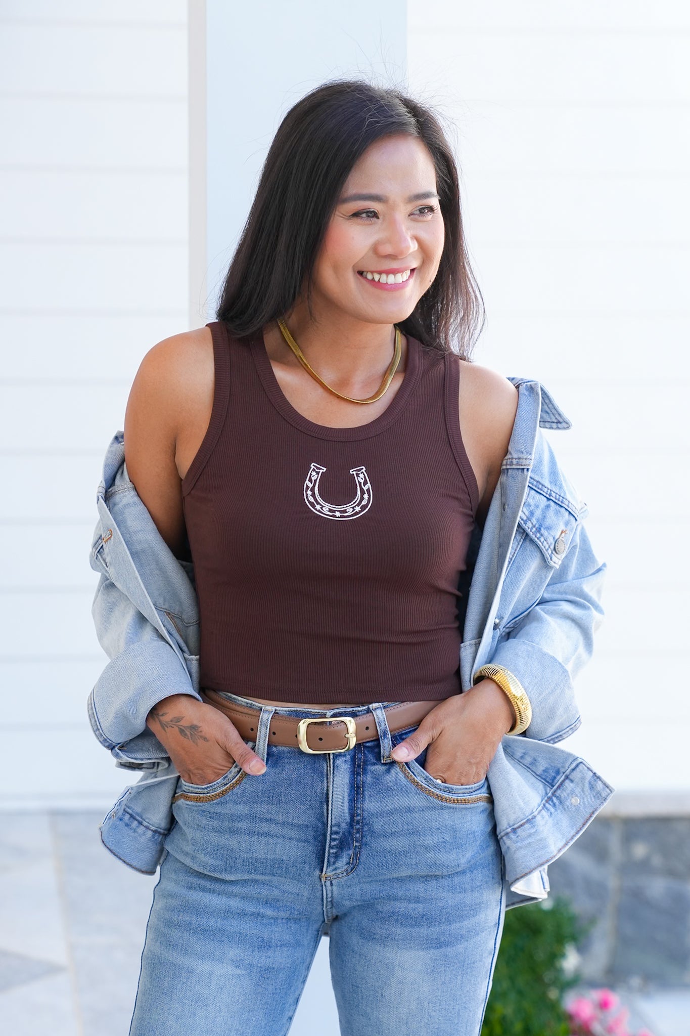 This tank brings western flair in a sleek, modern way. The ribbed knit hugs just right while the embroidered horseshoe detail adds a touch of rodeo-ready charm. Style it solo with denim shorts for summer or layered under a denim jacket when the temps drop.