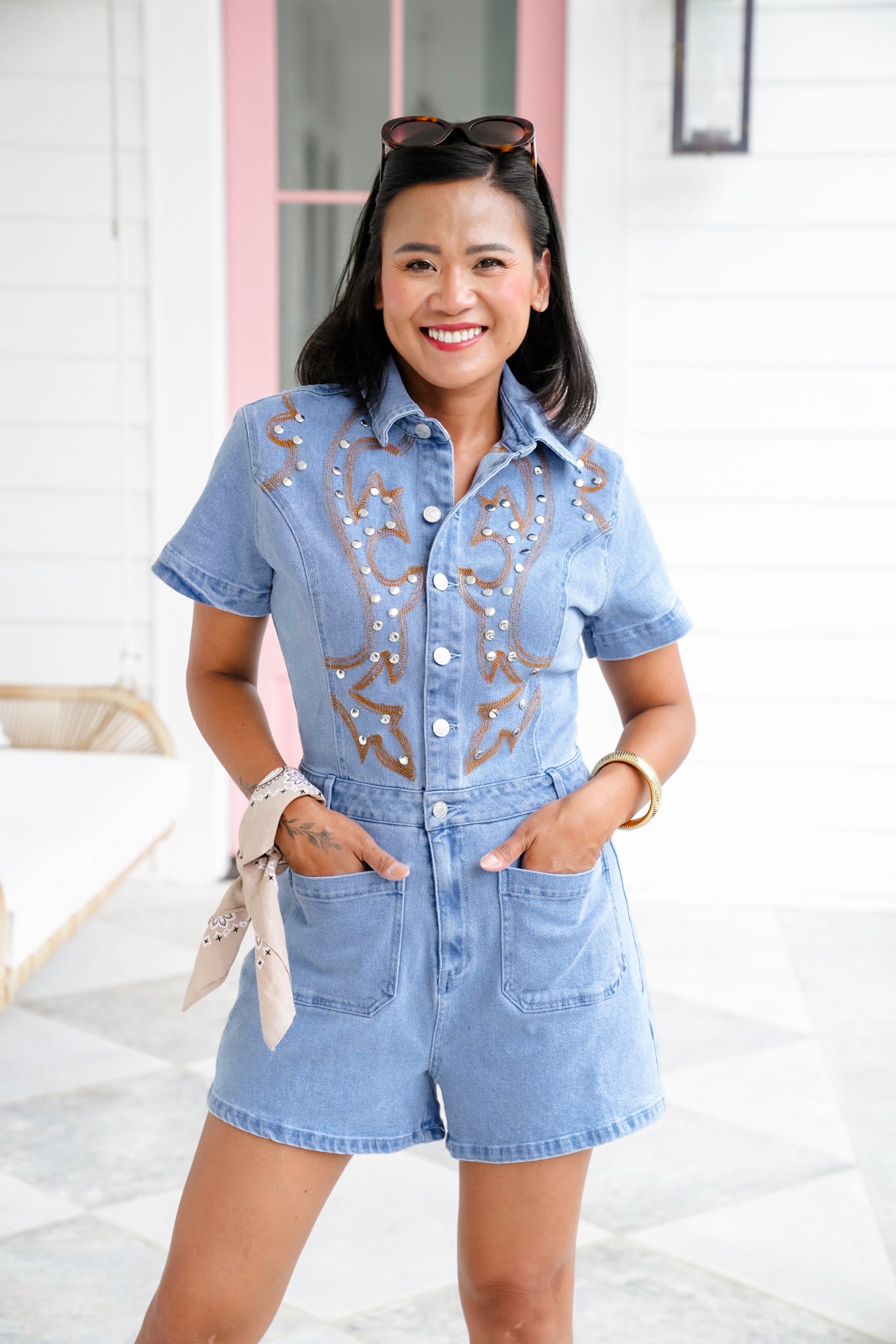 She’s western-inspired and ready to shine! This romper brings a mix of cute and cool with bold embroidery, stud accents, and a polished fit. Toss on boots or sandals, grab a wide-brimmed hat, and you're good to go from festival to farmer’s market.